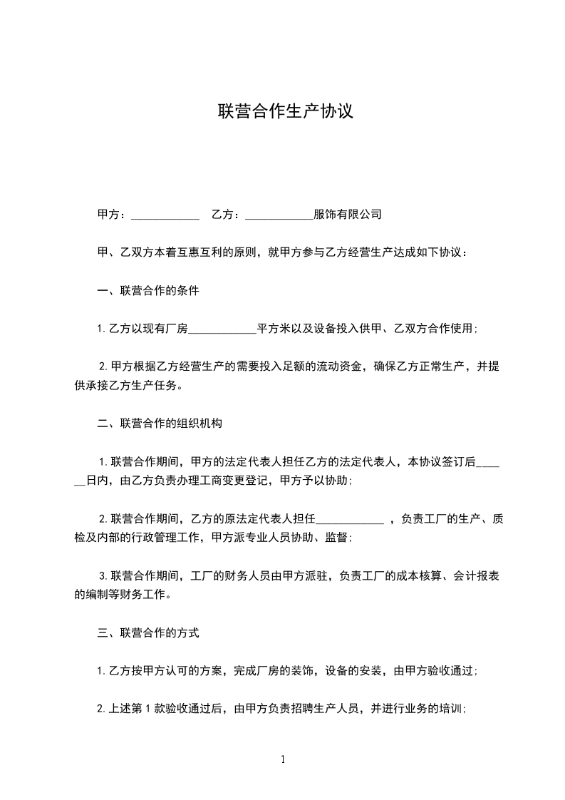 1.乙方以现有厂房 平方米以及设备投入供甲、乙双方合作使用;