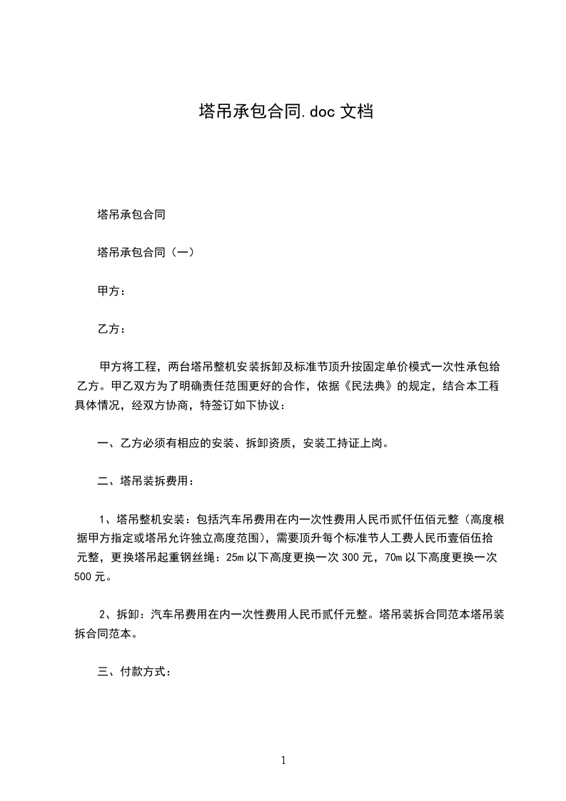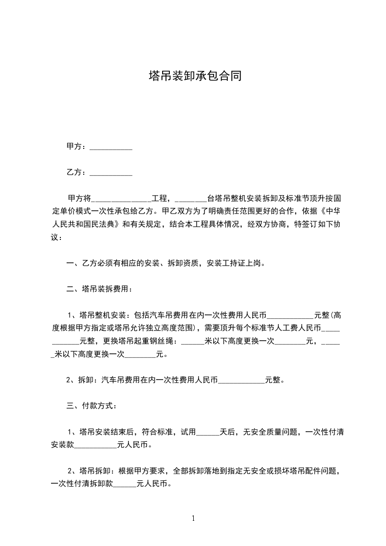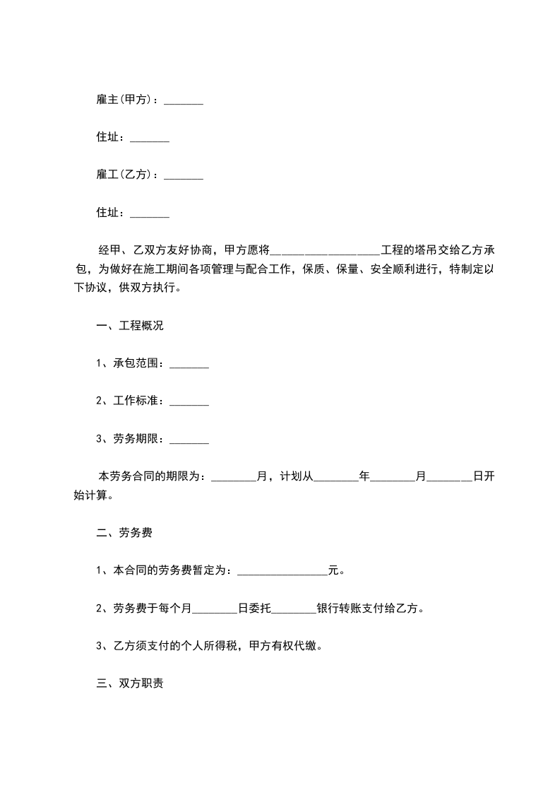 经甲、乙双方友好协商,甲方愿将___________________工程的塔吊交给乙方承包,为做好在施工期间各项管理与配合工作,保质、保量、安全顺利进行,特制定以下协议,供双方执行。
