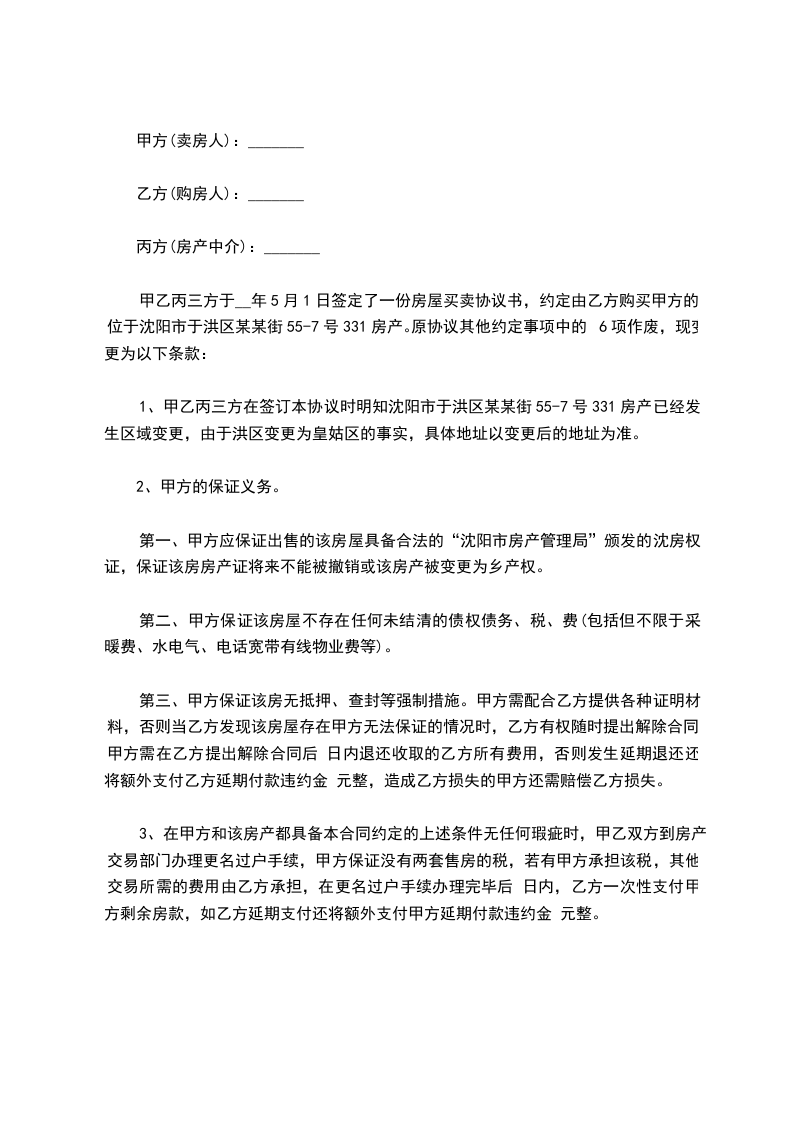 甲乙丙三方于__年5月1日签定了一份房屋买卖协议书,约定由乙方购买甲方的位于沈阳市于洪区某某街55-7号331房产。原协议其他约定事项中的6项作废,现变更为以下条款: