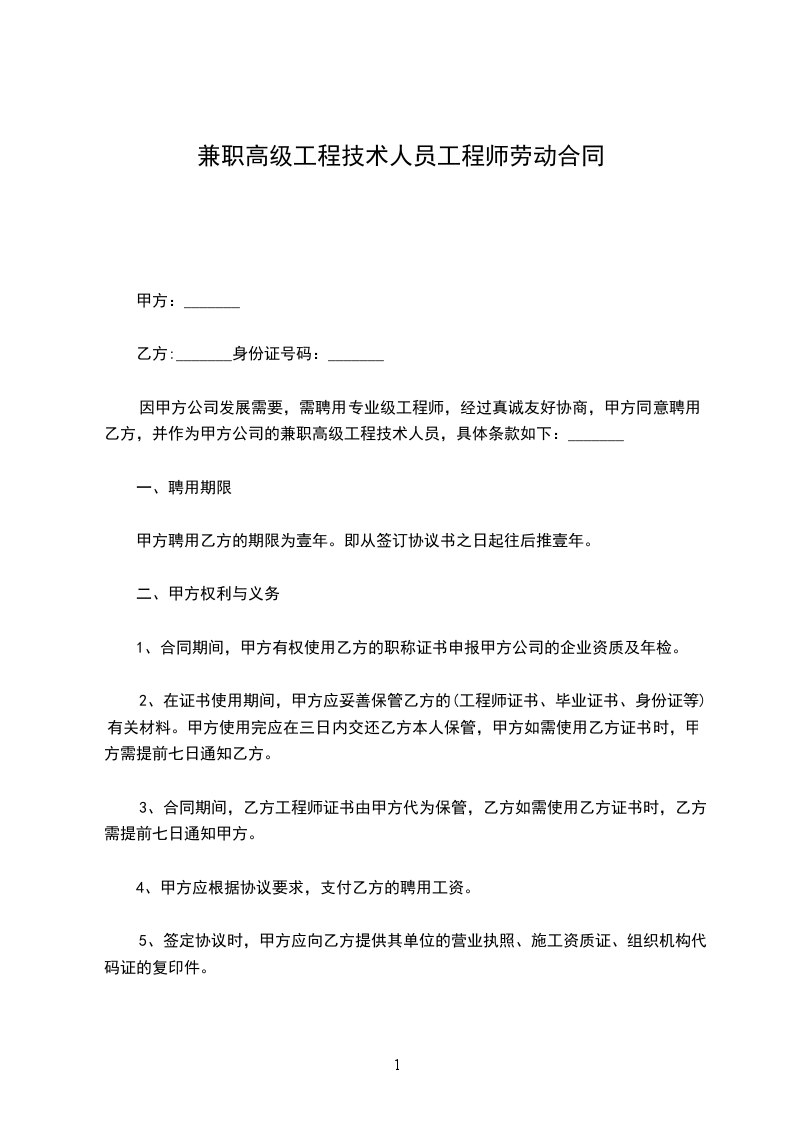 因甲方公司发展需要,需聘用专业级工程师,经过真诚友好协商,甲方同意聘用乙方,并作为甲方公司的兼职高级工程技术人员,具体条款如下:_______