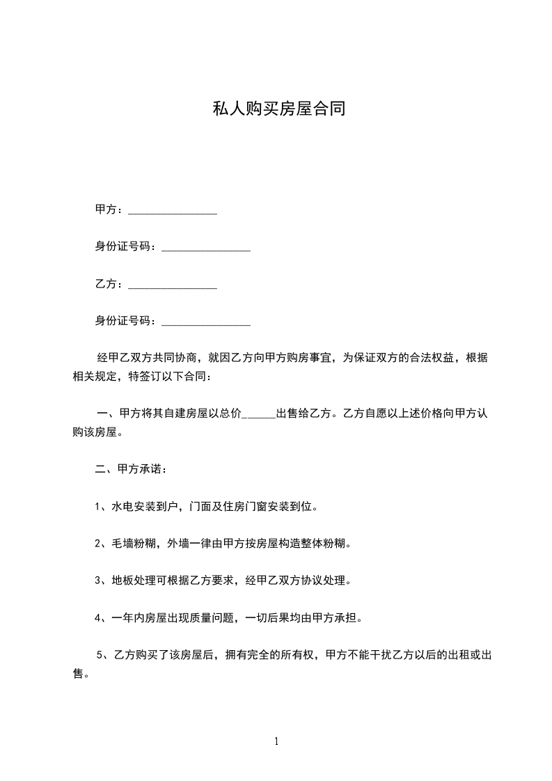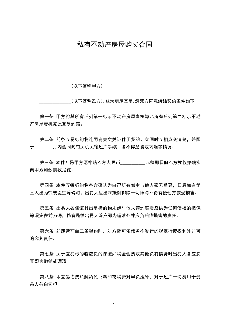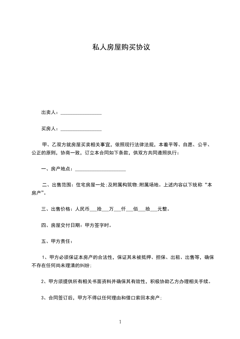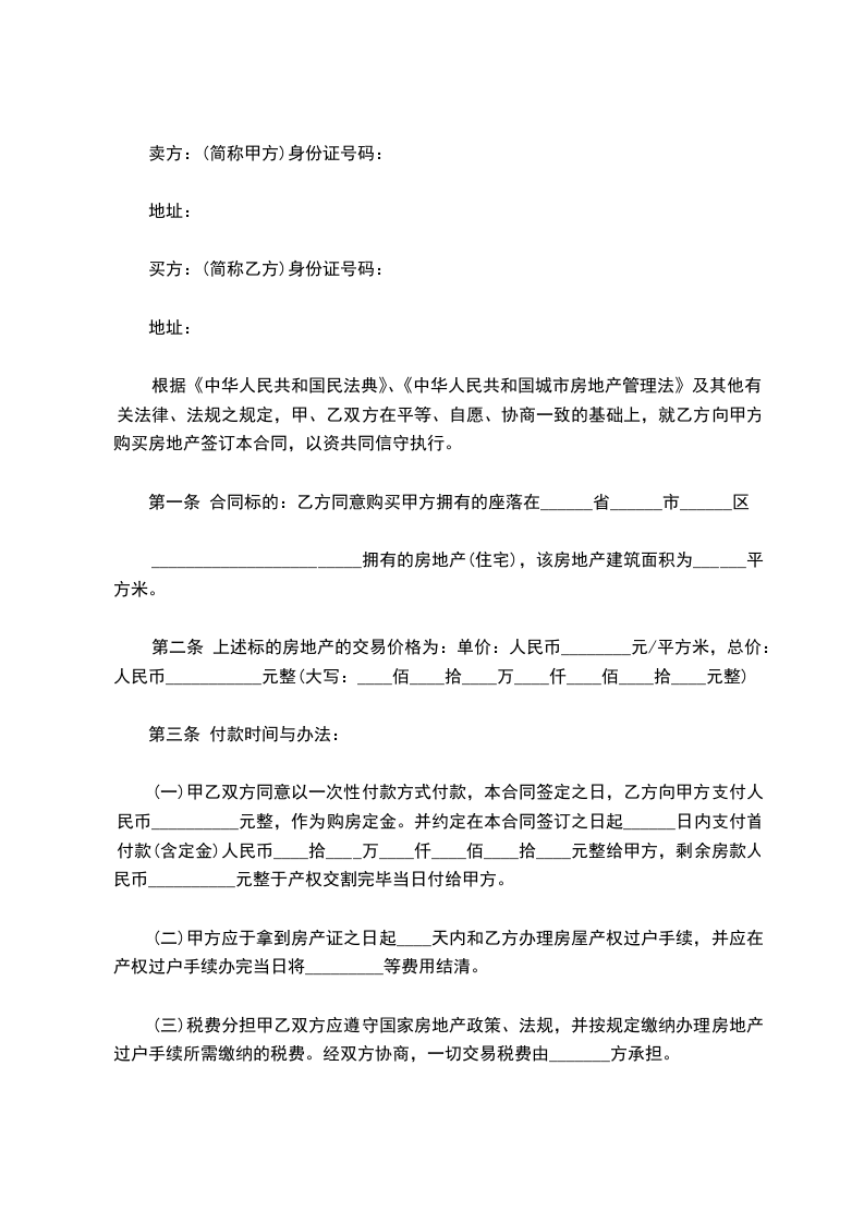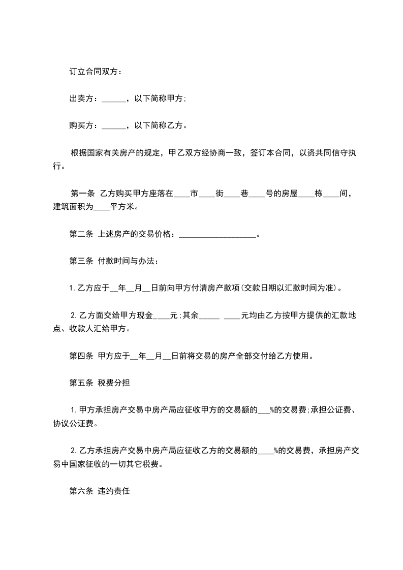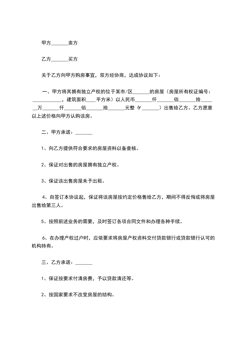 一、甲方愿将自有坐落____________市__________路___号房屋___间,建筑面积____平方米售卖给乙方。