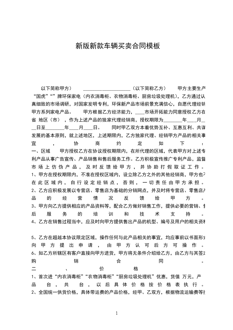 以下简称甲方) ____________________(以下简称乙方) 甲方主要生产“国虎”“”牌环保家电(内衣消毒柜、衣物消毒柜、厨房垃圾处理机),乙方通过认真细致的市场调研,对国家发明专利,环保新产品市场前景充满信心,自愿代理经销甲方系列家电产品。 甲方根据乙方经济能力,____市场开拓能力同意授权乙方在 省 地区(市) ,作为上述产品的独家代理经销商,授权期限为________年____月____日至________年____月____日。 同时甲乙双方本着优势互补、互惠互利、共谋发展的基本原则,就上述地区,上述期限内,乙方独家代理、经销甲方产品的相关事宜,协商约定如下: