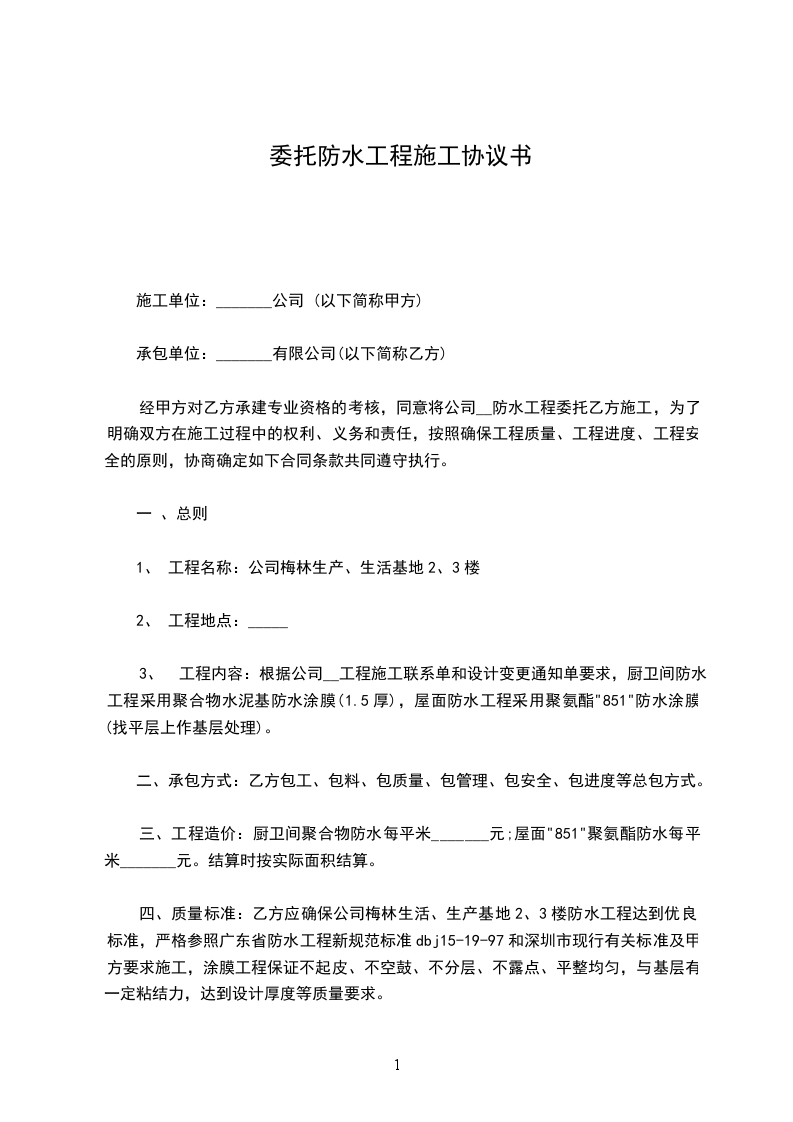 经甲方对乙方承建专业资格的考核,同意将公司_________防水工程委托乙方施工,为了明确双方在施工过程当中的权利、义务和责任,按照确保工程质量、工程进度、工程安全的原则,协商确定如下合同条款共同遵守执行。
