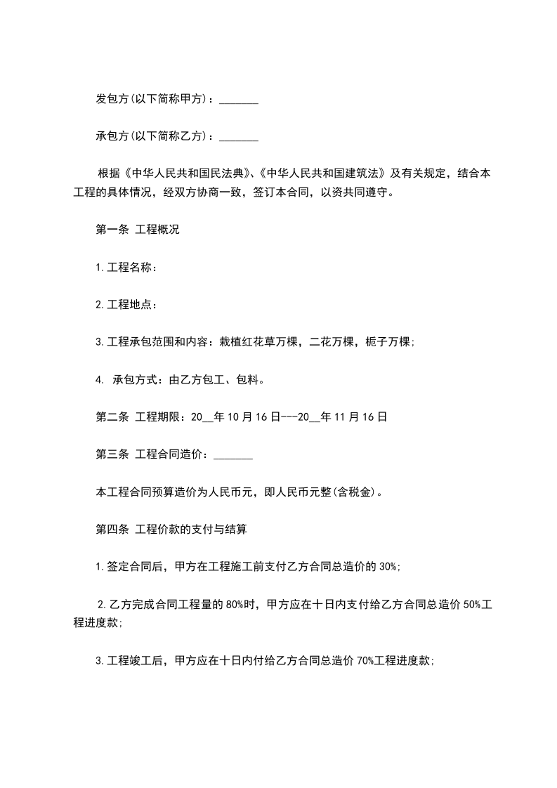 3.工程承包范围和内容:栽植红花草万棵,二花万棵,栀子万棵;