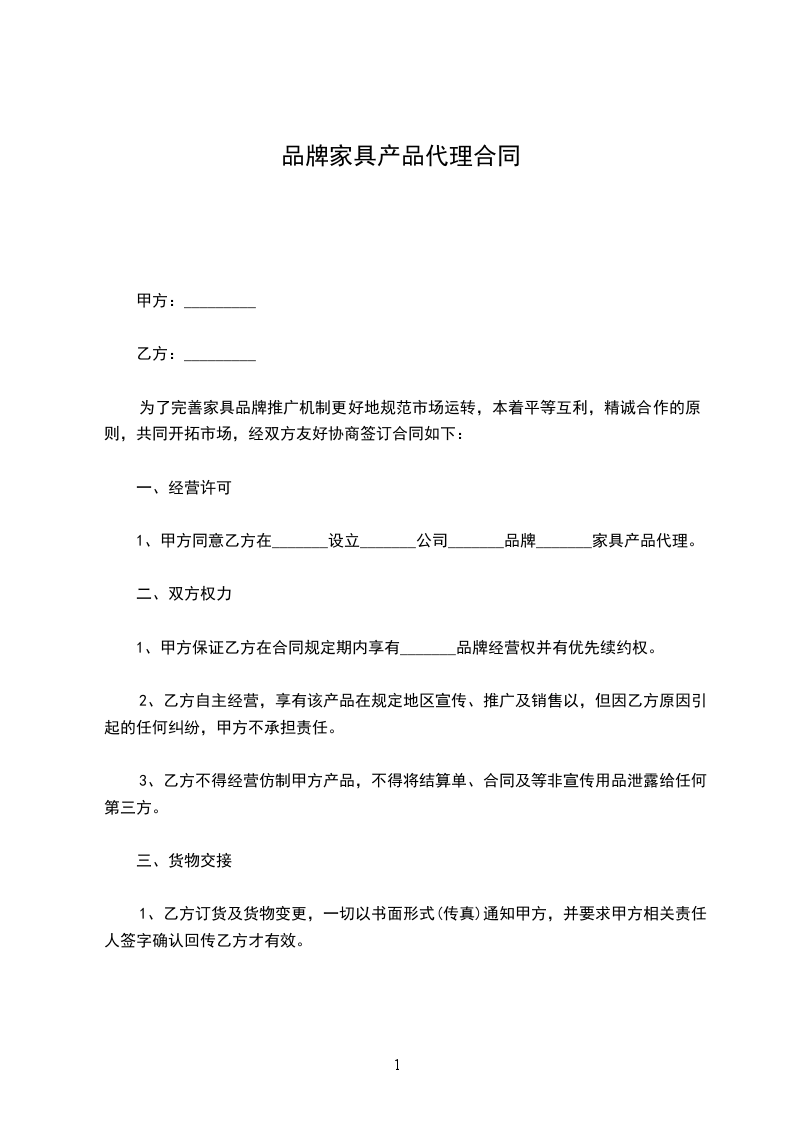 1、甲方同意乙方在_______设立_______公司_______品牌_______家具产品代理。