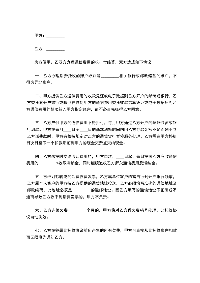 _________公司_________分公司(下称甲方)长期向客户(下称乙方)提供_________电话通信服务,为方便甲、乙双方办理通信费用的收、付结算,双方达成如下协议: