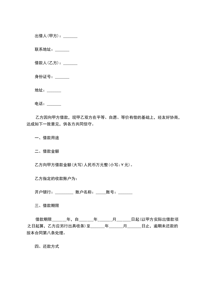 借款期限_______年,自_______年_______月_______日起(以甲方实际出借款项之日起算,乙方应另行出具收条)至_______年_______月_______日止,逾期未还款的,按本合同第八条处理。