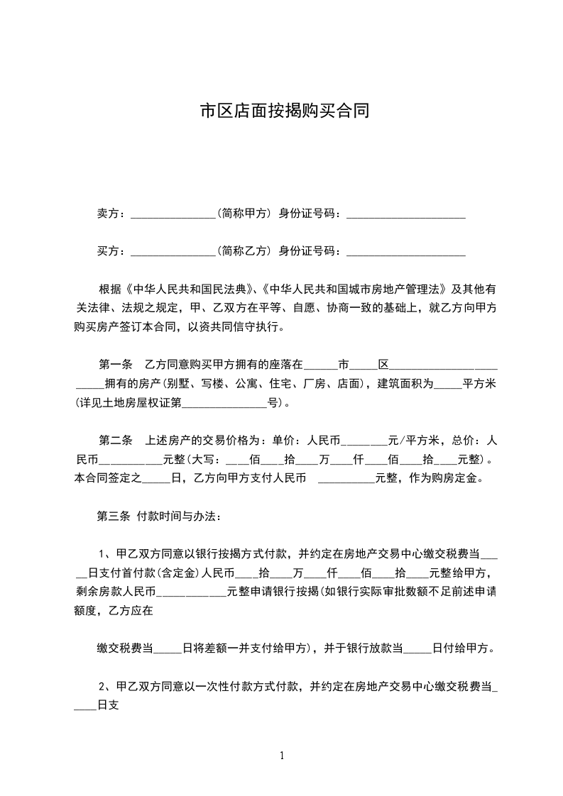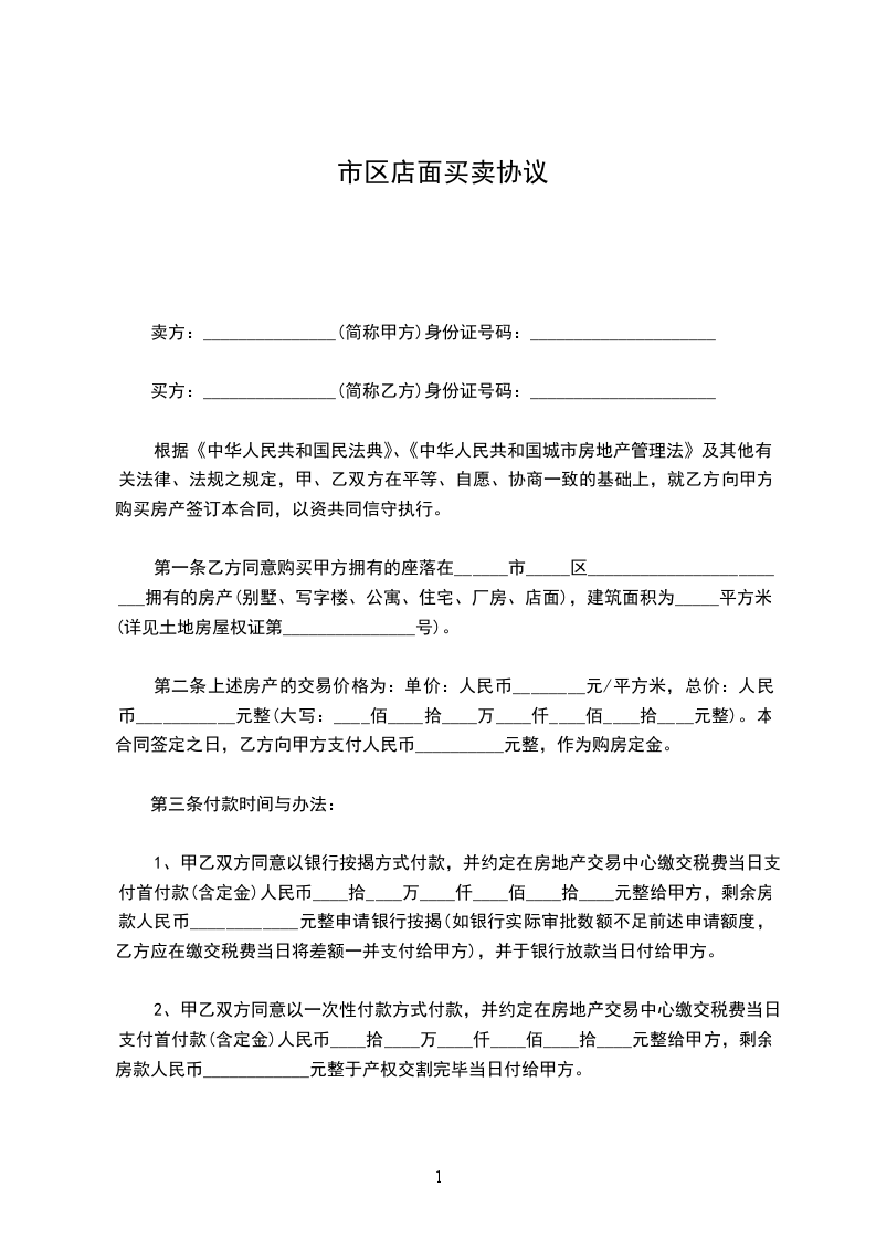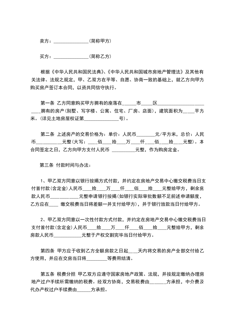 第一条乙方同意购买甲方拥有的坐落在______市_____区________________________拥有的房产(别墅、写字楼、公寓、住宅、厂房、店面),建筑面积为_____平方米。(详见土地房屋权证第_______________号)。