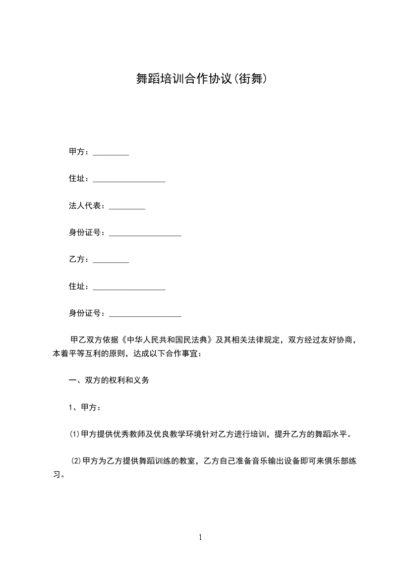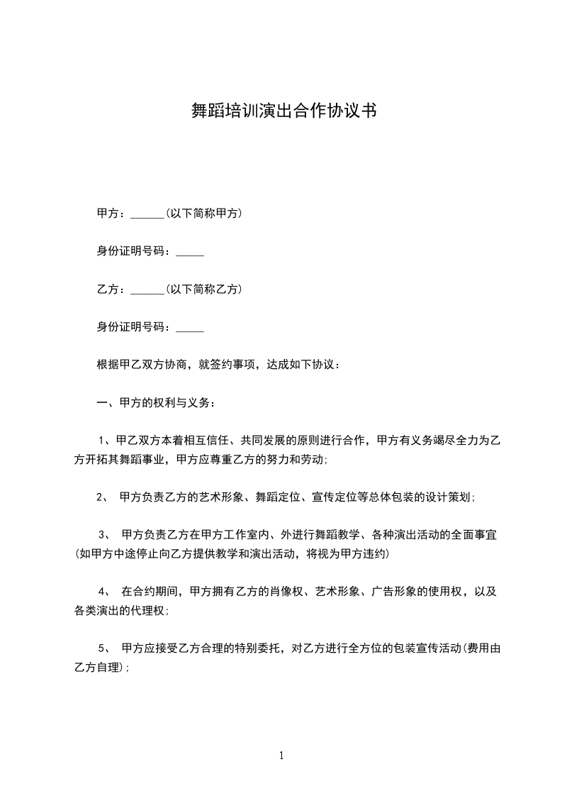 1、甲乙双方本着相互信任、共同发展的原则进行合作,甲方有义务竭尽全力为乙方开拓其舞蹈事业,甲方应尊重乙方的努力和劳动;