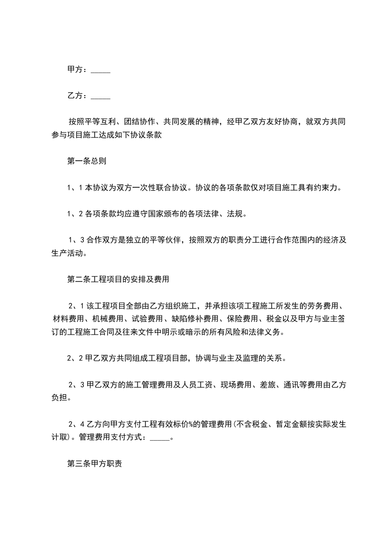 1、1本协议为双方一次性联合协议。协议的各项条款仅对项目施工具有约束力。