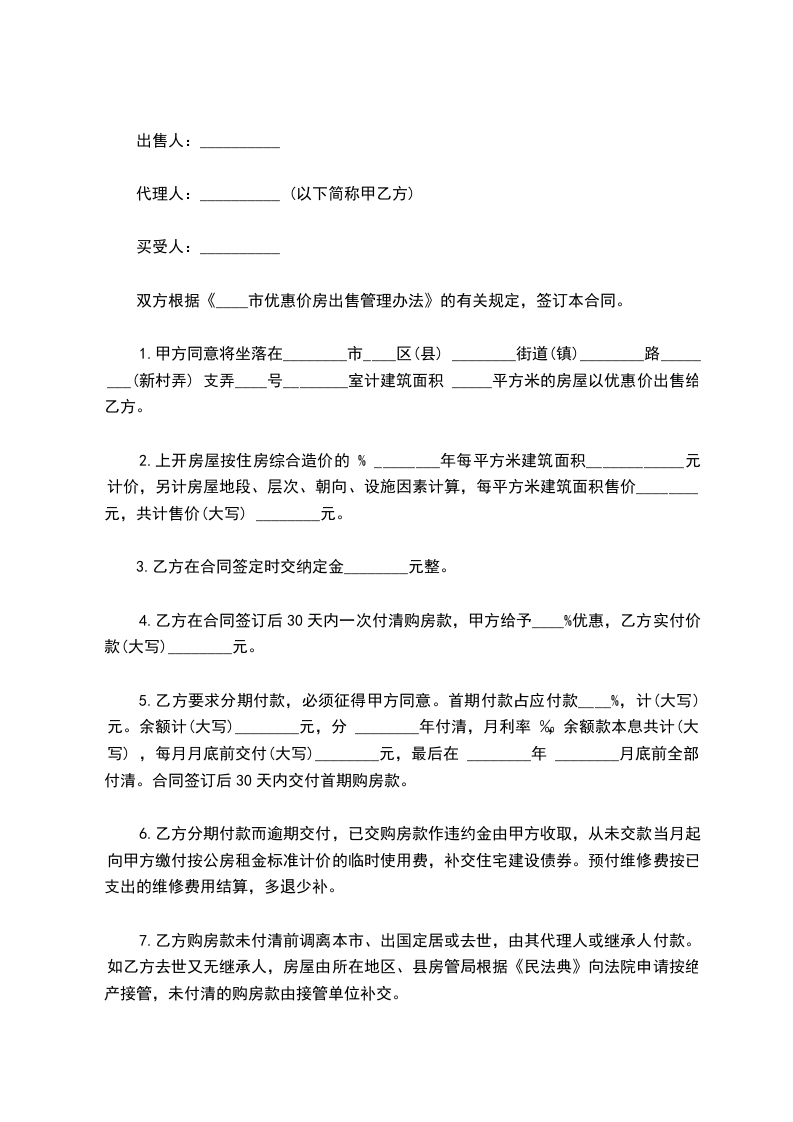 双方根据《____市优惠价房出售管理办法》的有关规定,签订本合同。