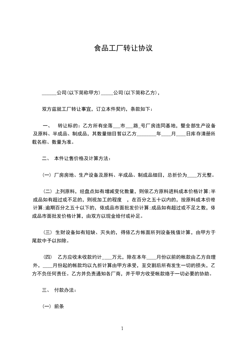 第一项的价格,于本契约成立同时,甲方交付乙方___万元,余款___万元,俟原料、成品、厂房房地、生产设备点交清楚同时,一次付清。