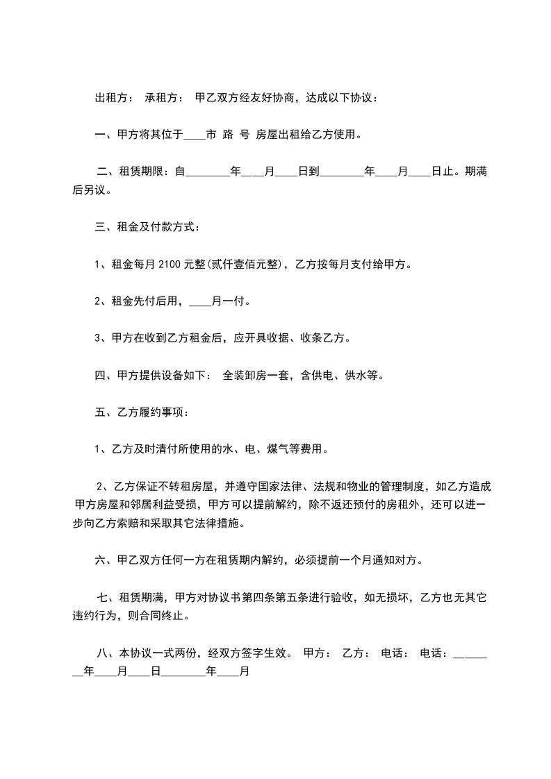 1、租金每月2100元整(贰仟壹佰元整),乙方按每月支付给甲方。