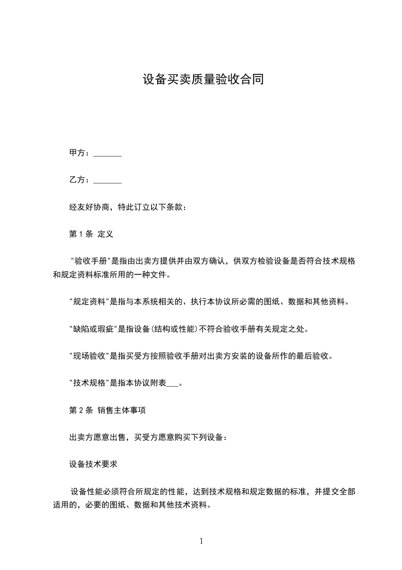 出卖方应在 ________年 ________月 ________日前完成设备的安装和调试工作;并完成验收手册所规定的各项检测;同时,出卖方须在设备验收单证上签字,证明业已完成检测。验收单证上应注明双方认可的,且应由出卖方在双方议定的期间内校正的仍可能存在的缺陷。