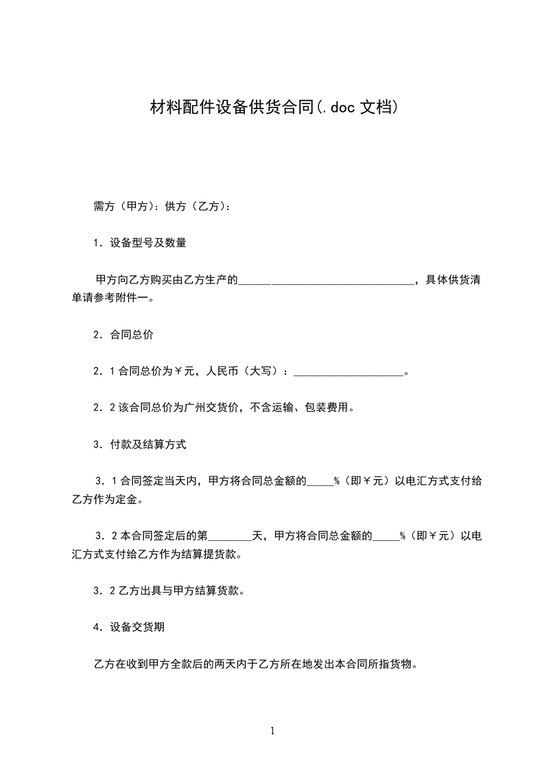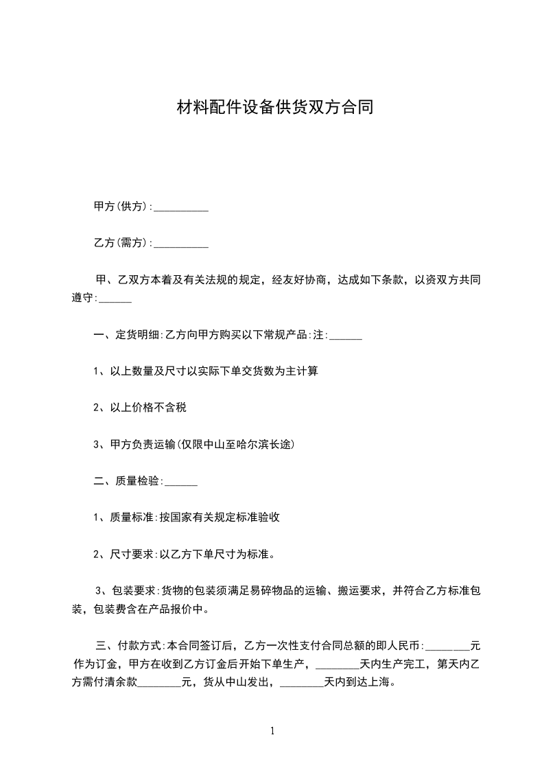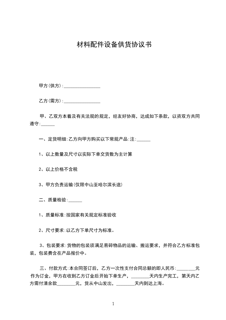 1.乙方送货的材料乙方须在收到甲方订单____日内将货物送至甲方指定的地点,