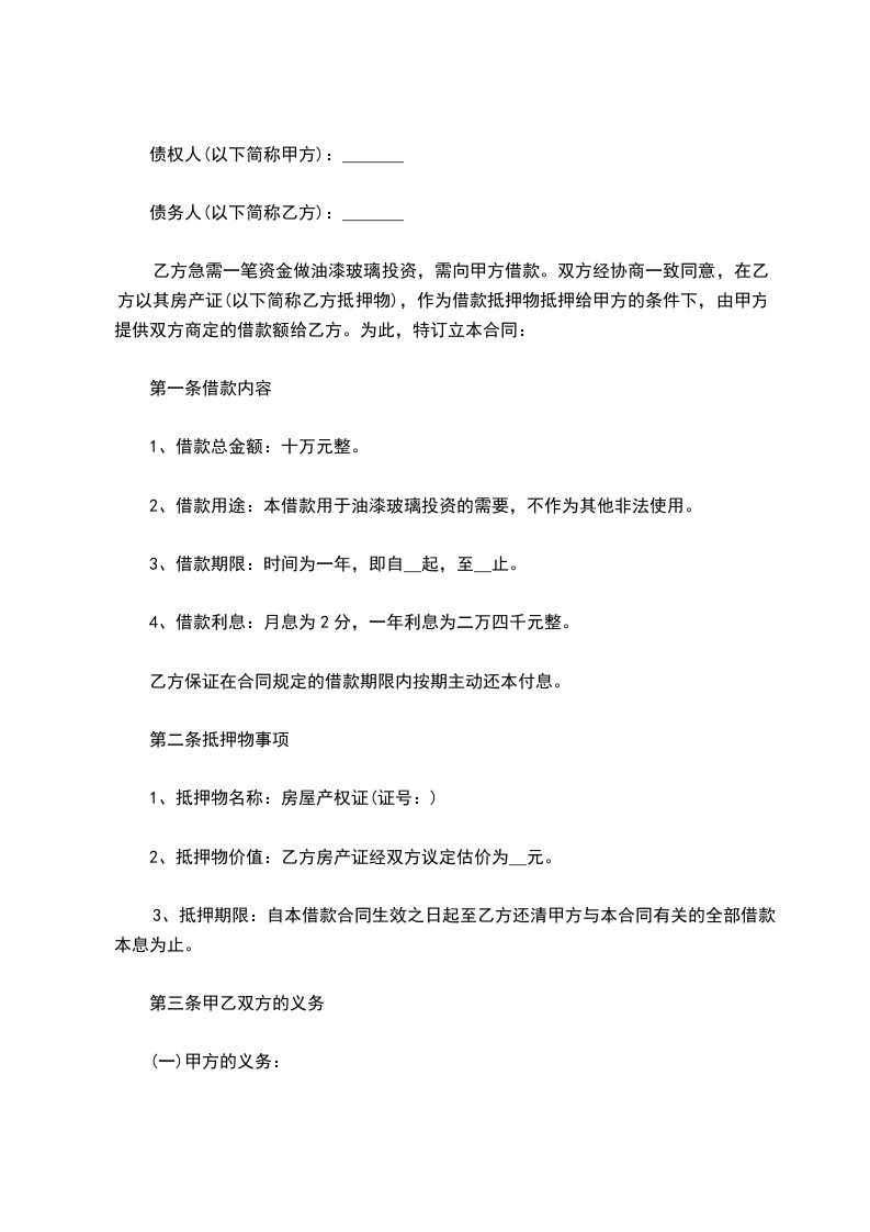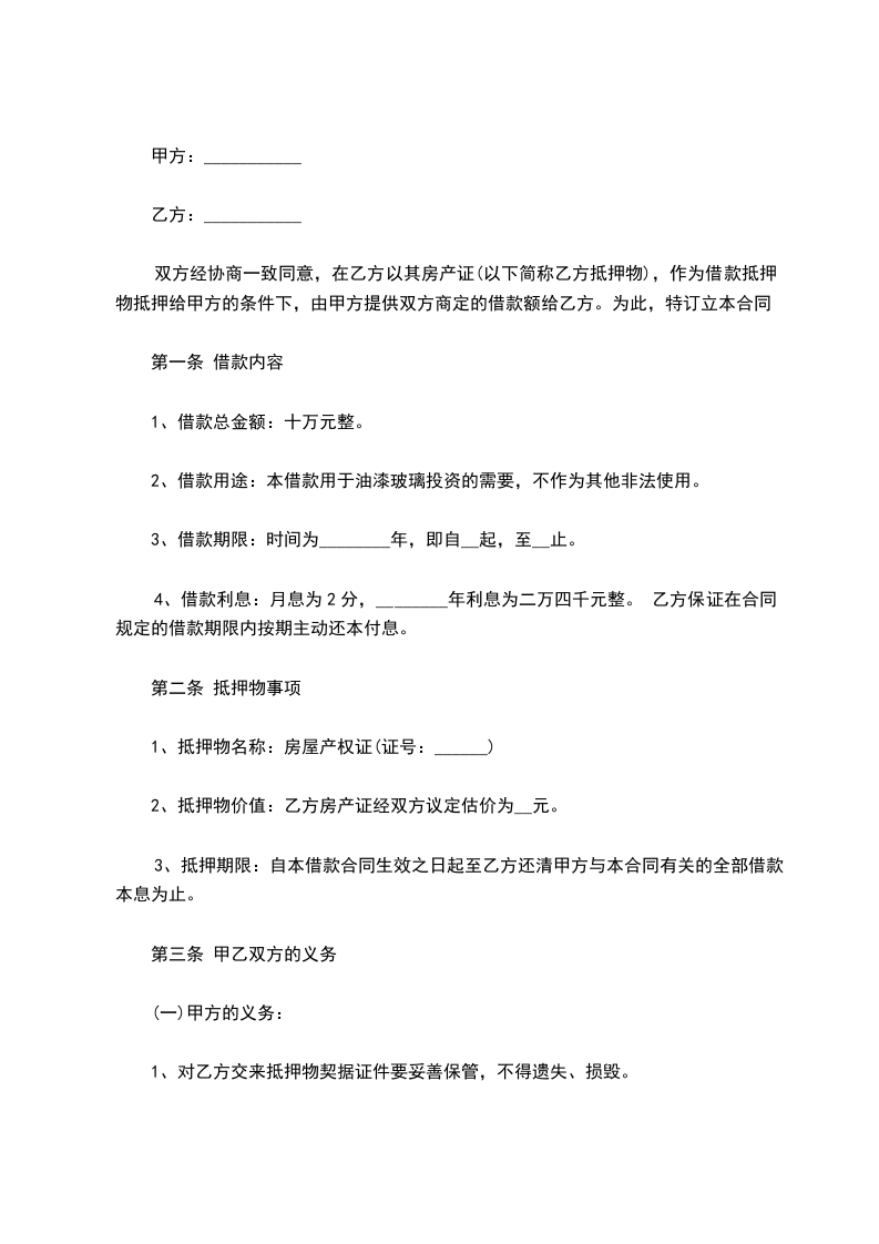 双方经协商一致同意,在乙方以其房产证(以下简称乙方抵押物),作为借款抵押物抵押给甲方的条件下,由甲方提供双方商定的借款额给乙方。为此,特订立本合同: