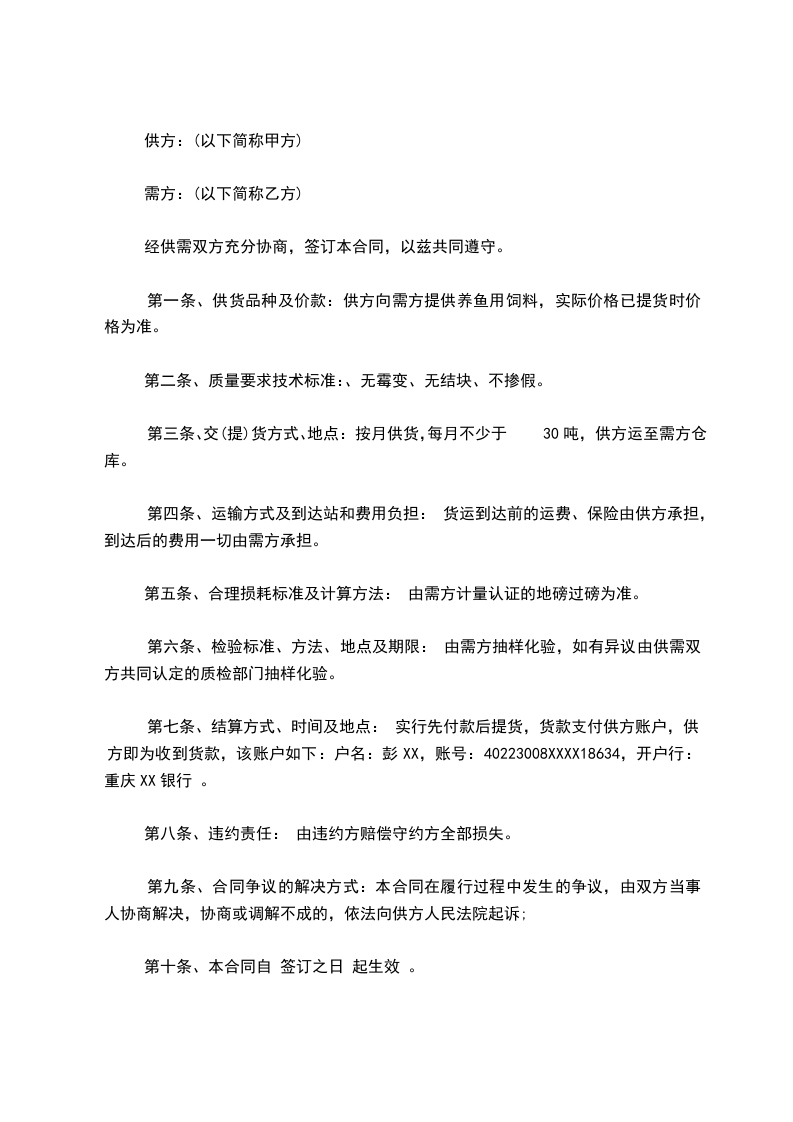 第一条、供货品种及价款:供方向需方提供养鱼用饲料,实际价格已提货时价格为准。