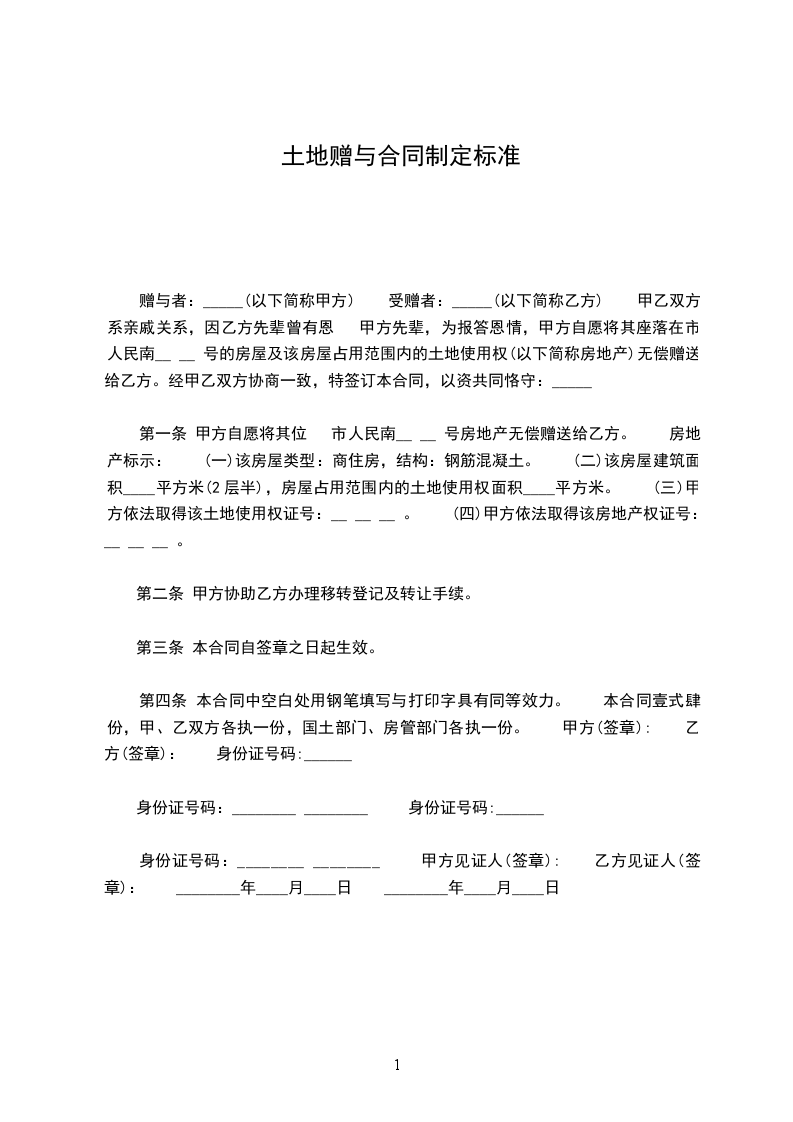 第一条 甲方自愿将其位 市人民南__ __ 号房地产无偿赠送给乙方。 房地产标示: (一)该房屋类型:商住房,结构:钢筋混凝土。 (二)该房屋建筑面积____平方米(2层半),房屋占用范围内的土地使用权面积____平方米。 (三)甲方依法取得该土地使用权证号:__ __ __ 。 (四)甲方依法取得该房地产权证号:__ __ __ 。