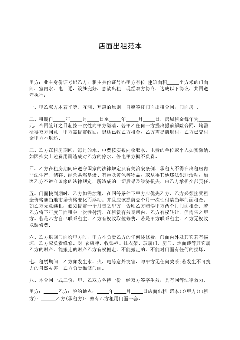 甲方:______乙方:签约地点:_____年_____月_____日店面出租 范本(2)甲方(出租方):______乙方(承租方):兹有乙方租用门面一套。