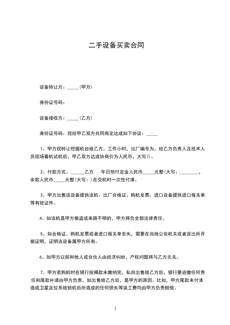 8、甲方在自己的场地上负责将该机设备安全装上乙方的运输车上。保证乙方顺利离开,乙方将一次性付清余款,该机产权属乙方所有。