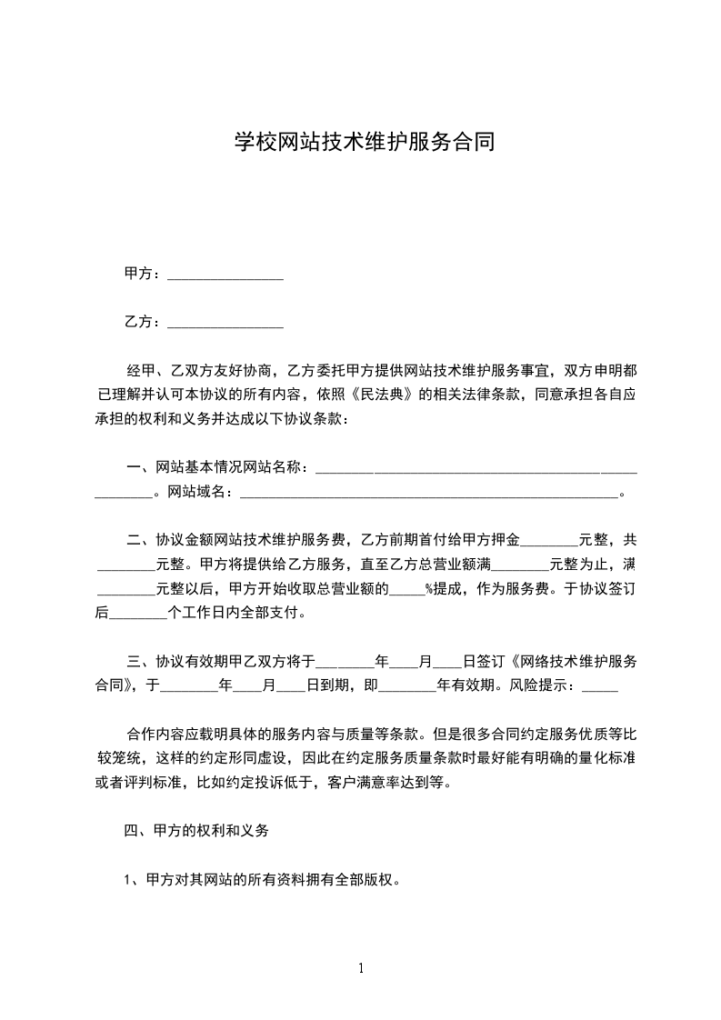 经甲、乙双方友好协商,乙方委托甲方提供网站技术维护服务事宜,双方申明都已理解并认可本协议的所有内容,依照《民法典》的相关法律条款,同意承担各自应承担的权利和义务并达成以下协议条款: