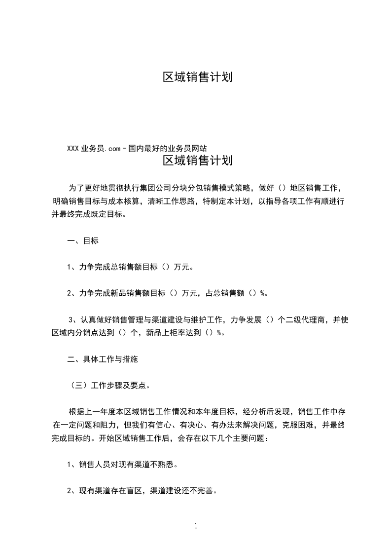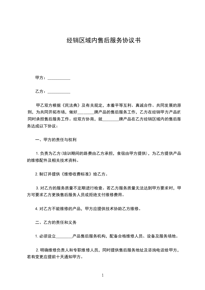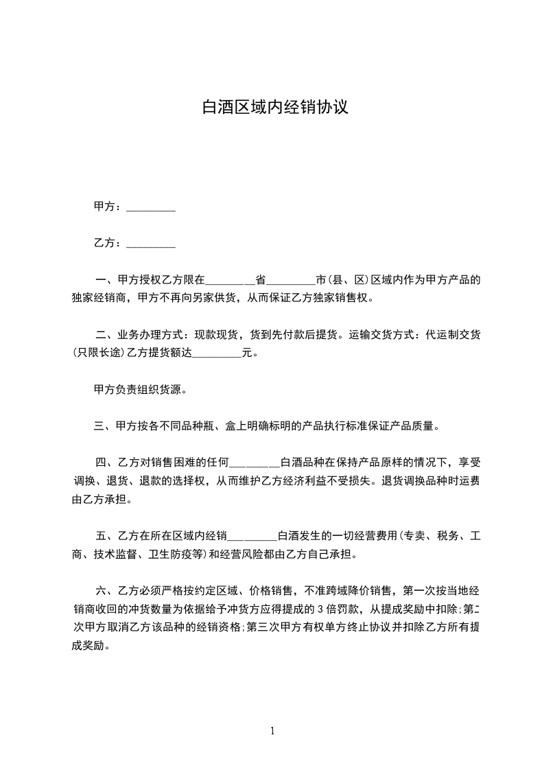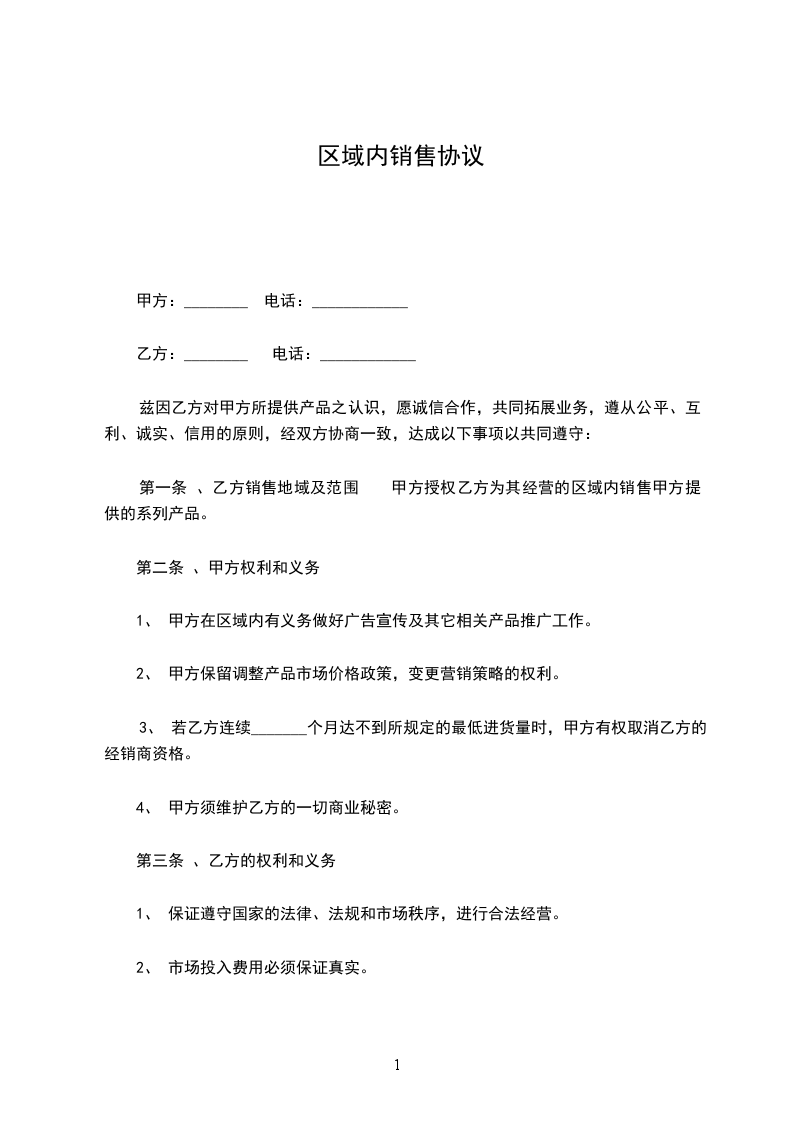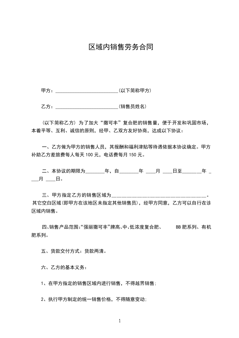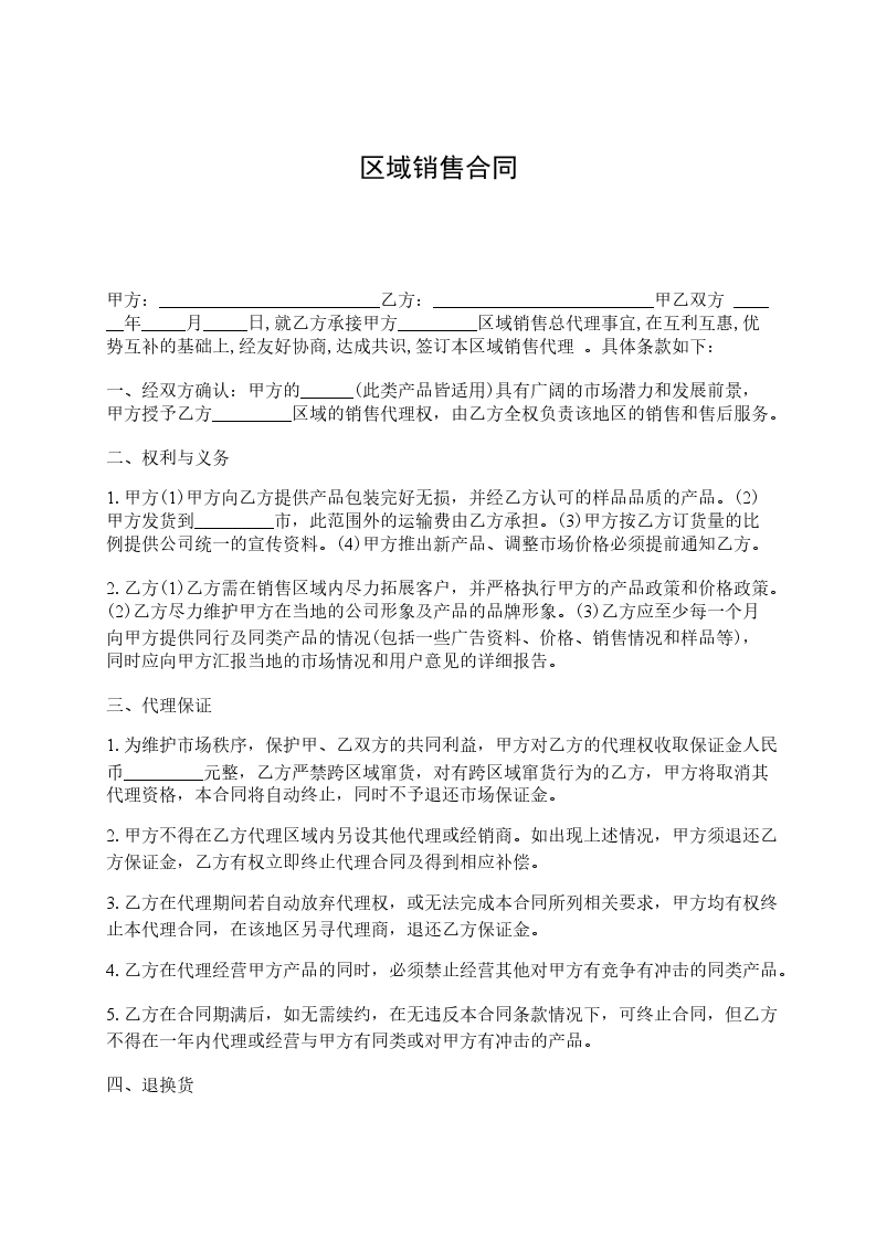 三、甲方指定乙方的销售区域为_____________________________________。 其它空白区域(即甲方在该地区未指定其他销售员),经甲方同意,乙方可以自行在该区域内销售。