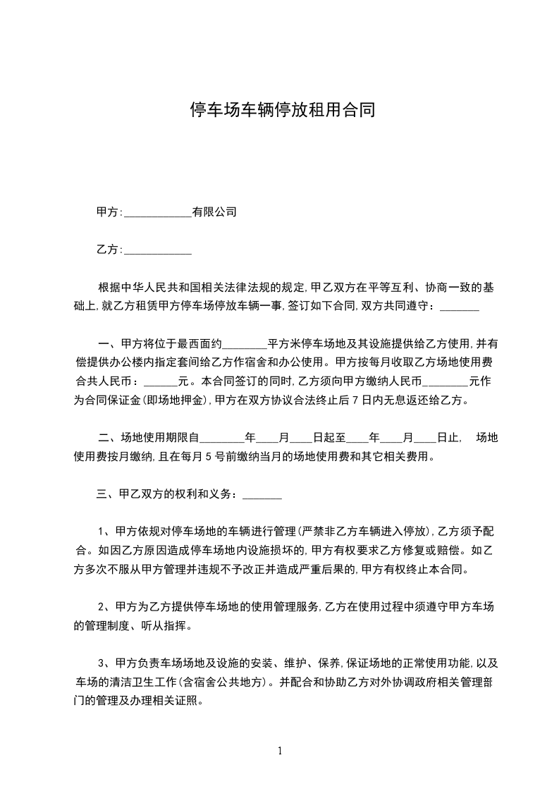 根据中华人民共和国相关法律法规的规定,甲乙双方在平等互利、协商一致的基础上,就乙方租赁甲方停车场停放车辆一事,签订如下合同,双方共同遵守:_______