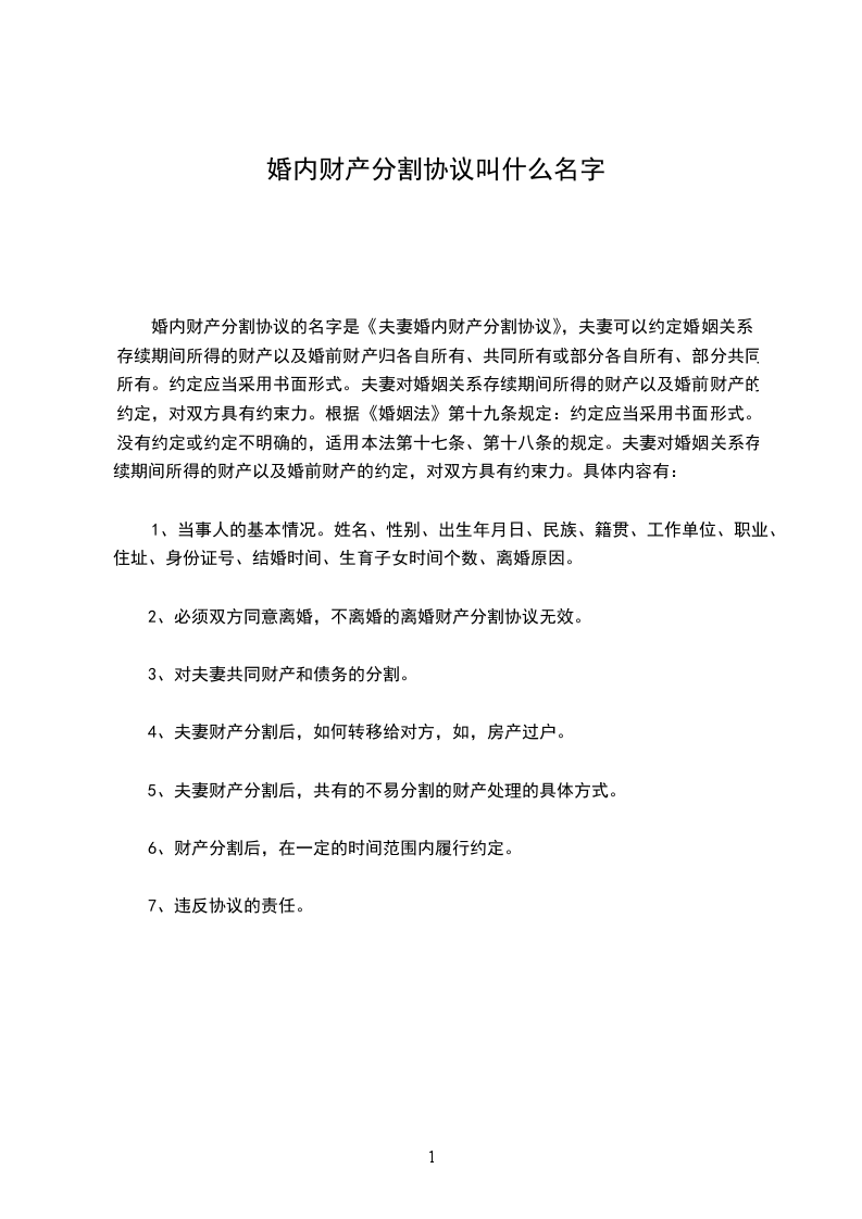 婚内财产分割协议的名字是《夫妻婚内财产分割协议》,夫妻可以约定婚姻关系存续期间所得的财产以及婚前财产归各自所有、共同所有或部分各自所有、部分共同所有。约定应当采用书面形式。夫妻对婚姻关系存续期间所得的财产以及婚前财产的约定,对双方具有约束力。根据《婚姻法》第十九条规定:约定应当采用书面形式。没有约定或约定不明确的,适用本法第十七条、第十八条的规定。夫妻对婚姻关系存续期间所得的财产以及婚前财产的约定,对双方具有约束力。具体内容有:
