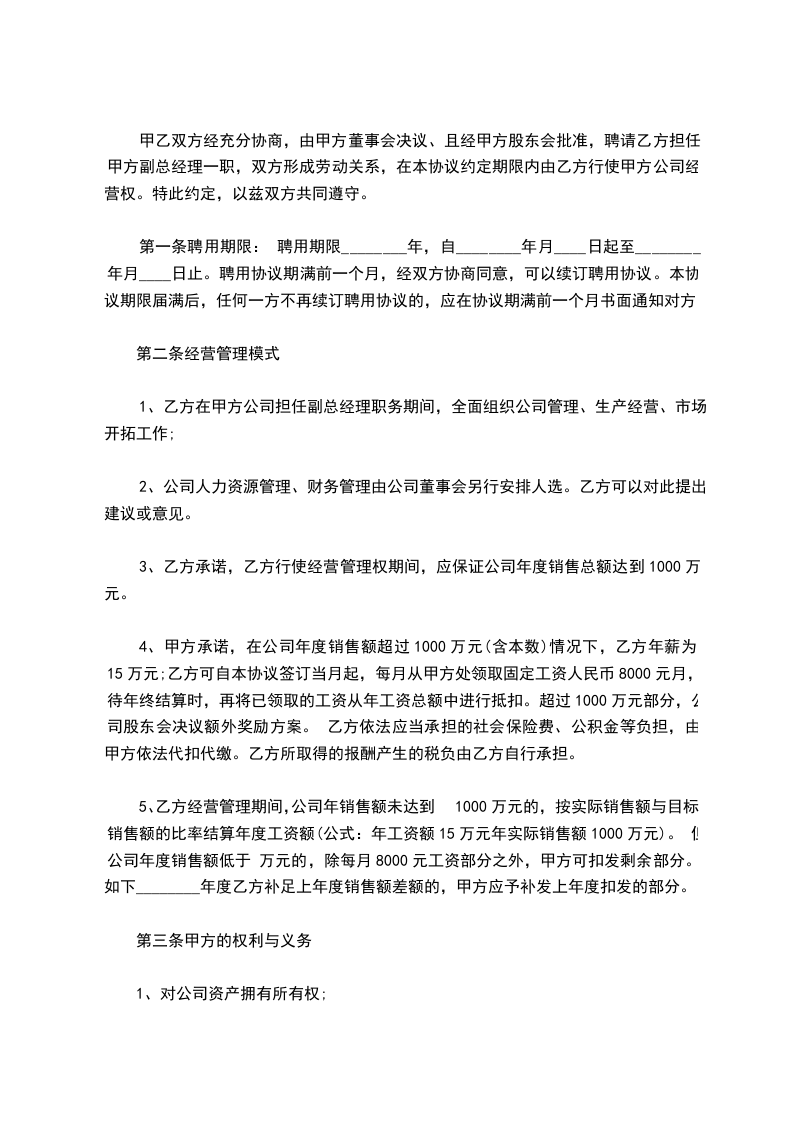 甲乙双方经充分协商,由甲方董事会决议、且经甲方股东会批准,聘请乙方担任甲方副总经理一职,双方形成劳动关系,在本协议约定期限内由乙方行使甲方公司经营权。特此约定,以兹双方共同遵守。