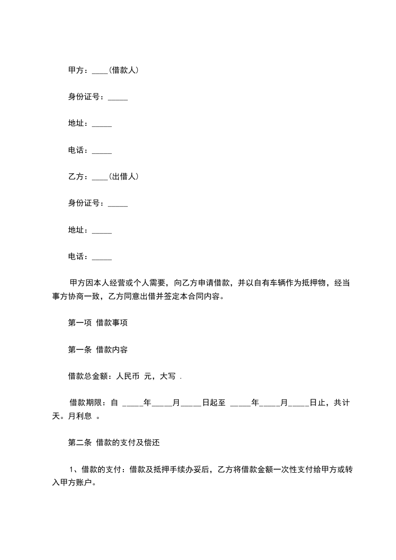 甲方因本人经营或个人需要,向乙方申请借款,并以自有车辆作为抵押物,经当事方协商一致,乙方同意出借并签定本合同内容。