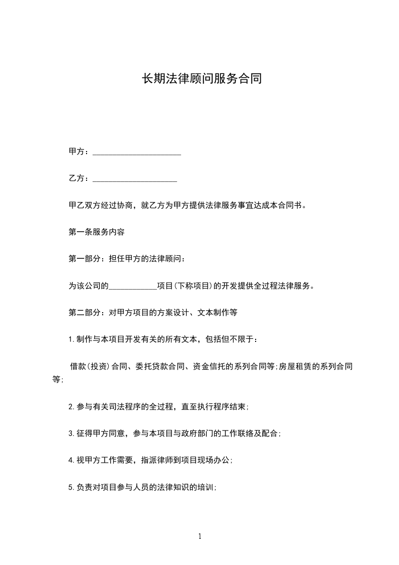 第一条 效劳律师 甲方根据乙方的延聘要求,指派本所_________律师担任乙方的终年家庭法令顾问,律师执业证号:_________。
