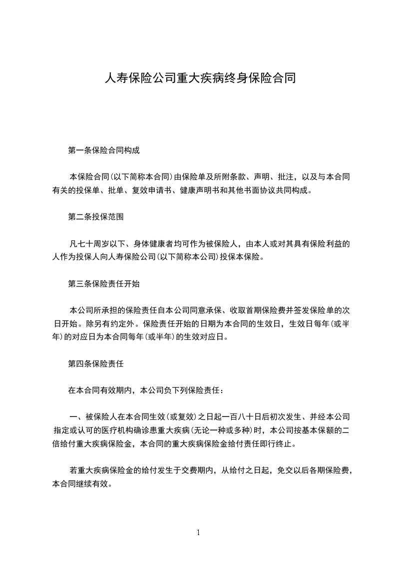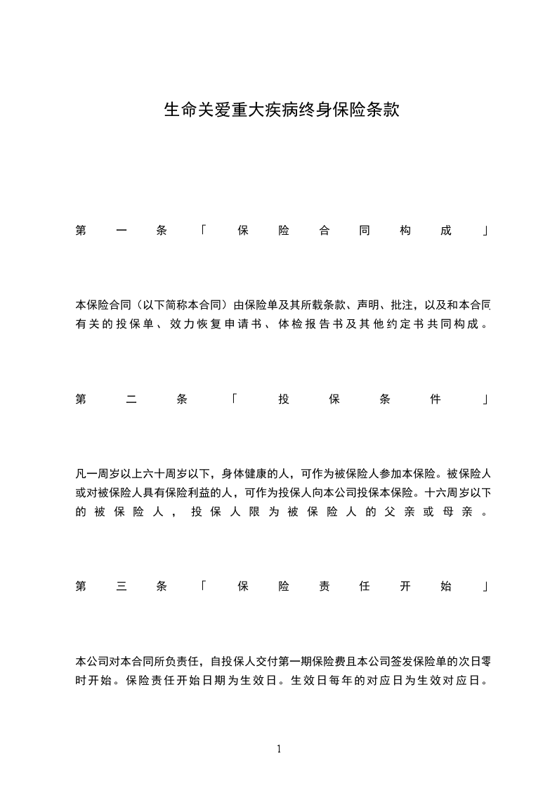一、本合同生效或复效一百八十日后被保险人被确诊初次罹患重大疾病,本公司按保险单所列明保险金额给付重大疾病保险金,本合同终止。