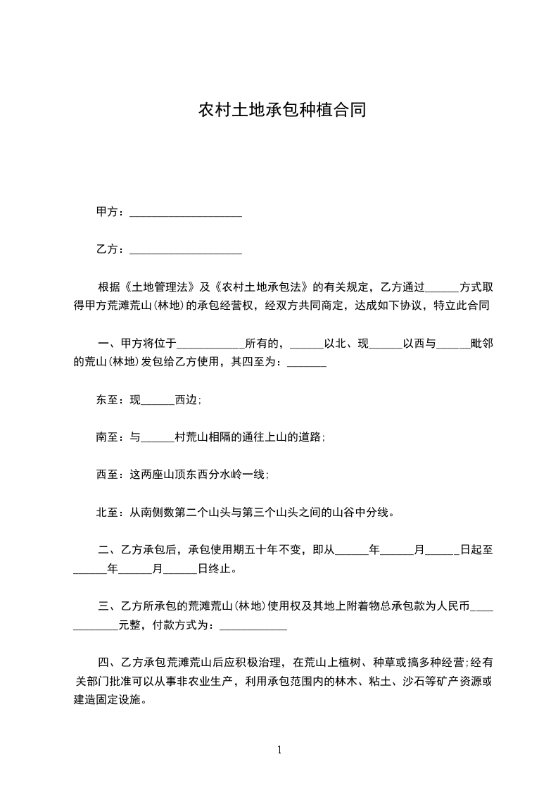 一、甲方将位于____________所有的,______以北、现______以西与______毗邻的荒山(林地)发包给乙方使用,其四至为:_______