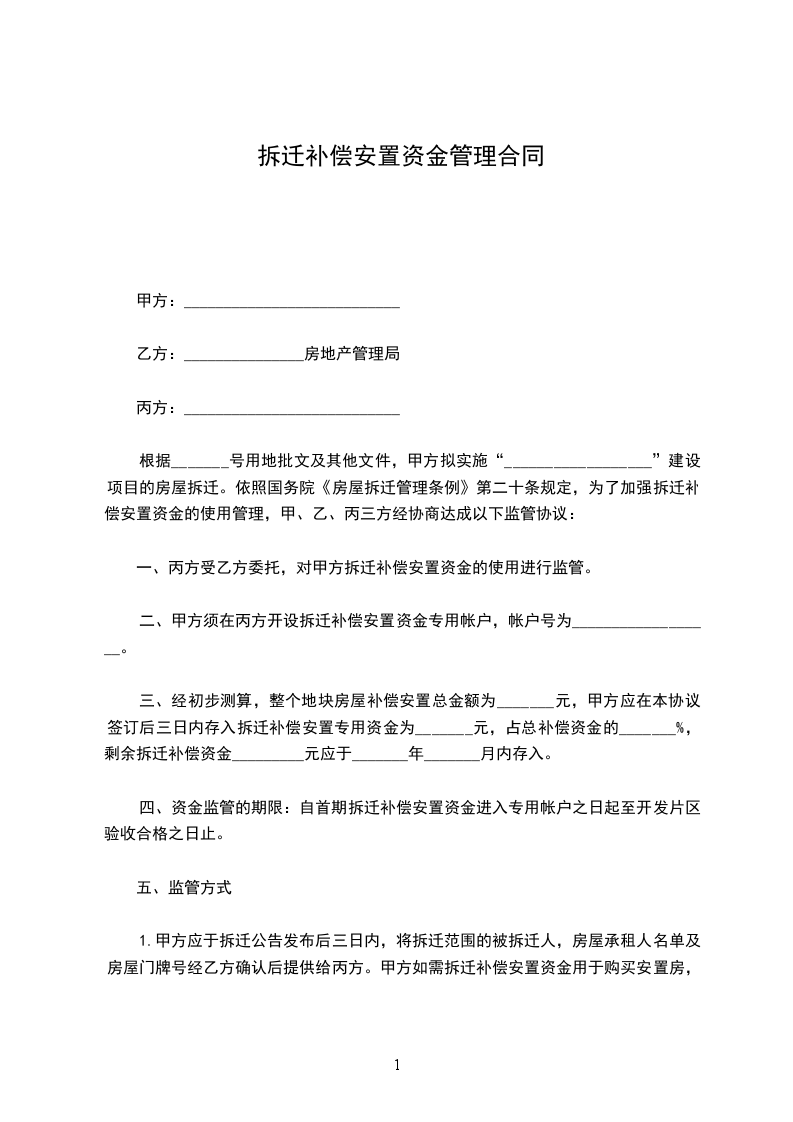 根据_______号用地批文及其他文件,甲方拟实施“__________________”建设项目的房屋拆迁。依照国务院《房屋拆迁管理条例》第二十条规定,为了加强拆迁补偿安置资金的使用管理,甲、乙、丙三方经协商达成以下监管协议: