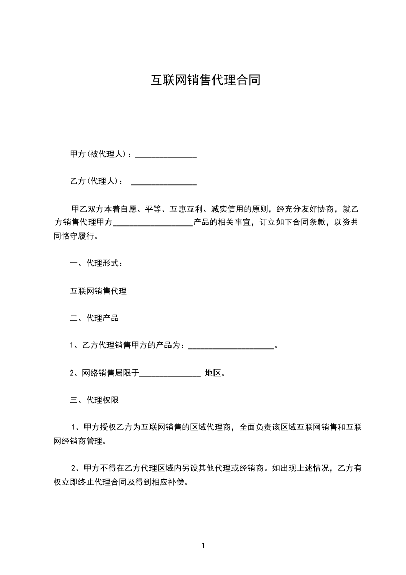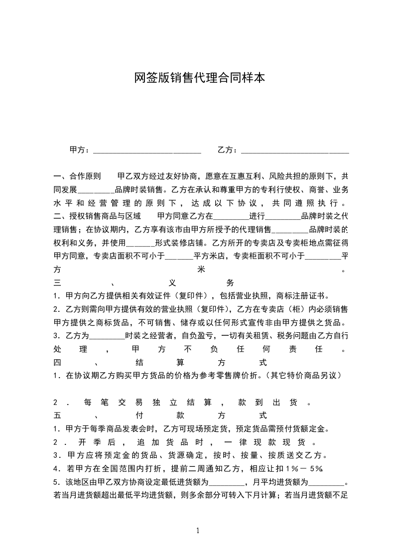 一、合作原则 甲乙双方经过友好协商,愿意在互惠互利、风险共担的原则下,共同发展_________品牌时装销售。乙方在承认和尊重甲方的专利行使权、商誉、业务水平和经营管理的原则下,达成以下协议,共同遵照执行。