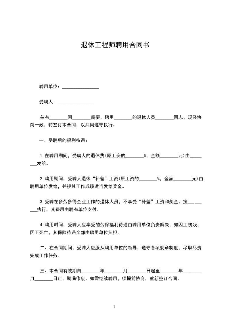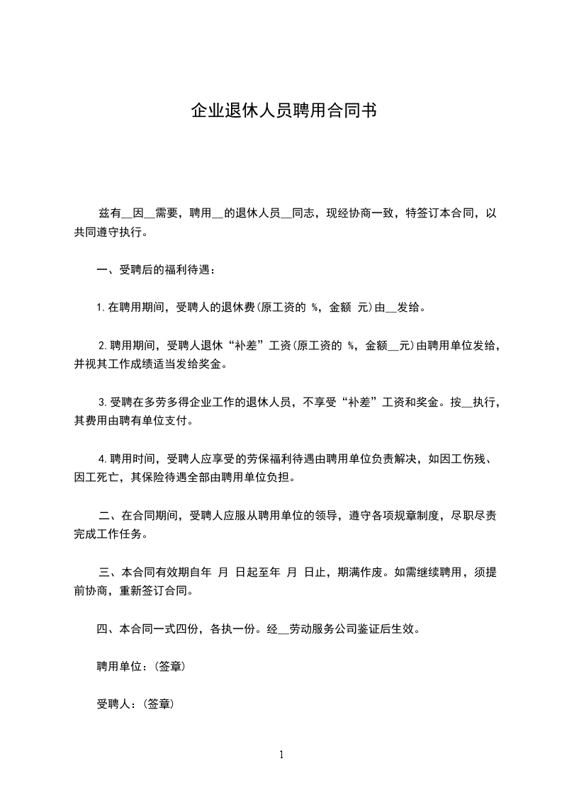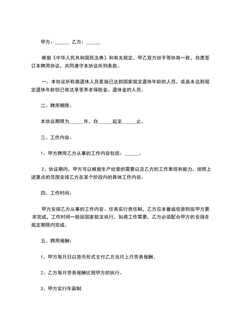 兹有________因________需要,聘用________的退休人员________同志,现经协商一致,特签订本合同,以共同遵守执行。