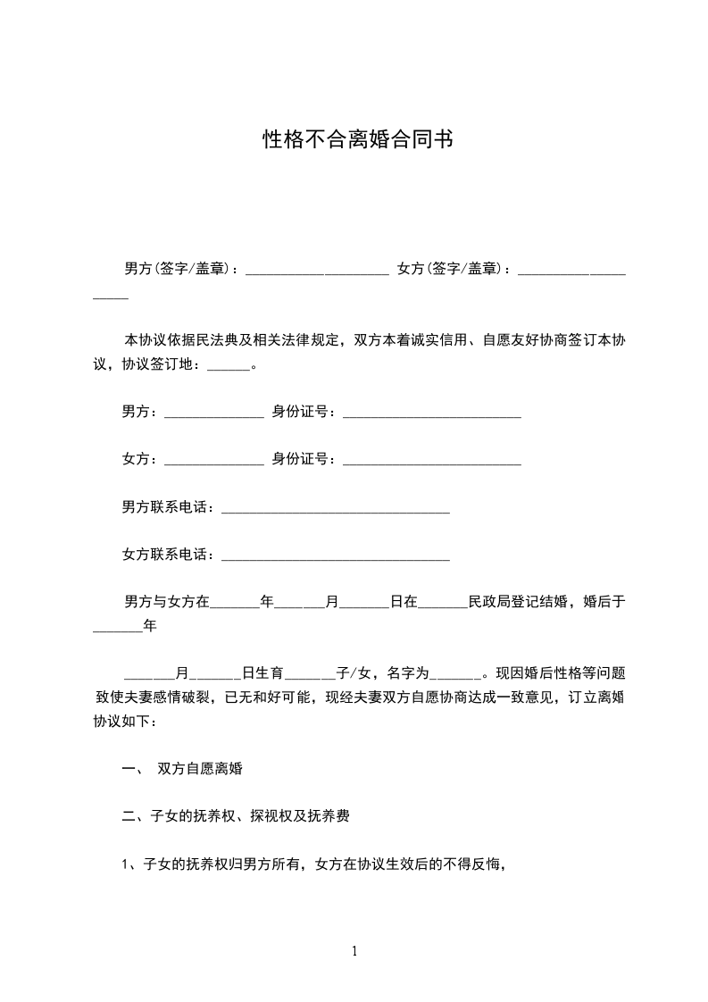 _______月_______日生育_______子/女,名字为_______。现因婚后性格等问题致使夫妻感情破裂,已无和好可能,现经夫妻双方自愿协商达成一致意见,订立离婚协议如下: