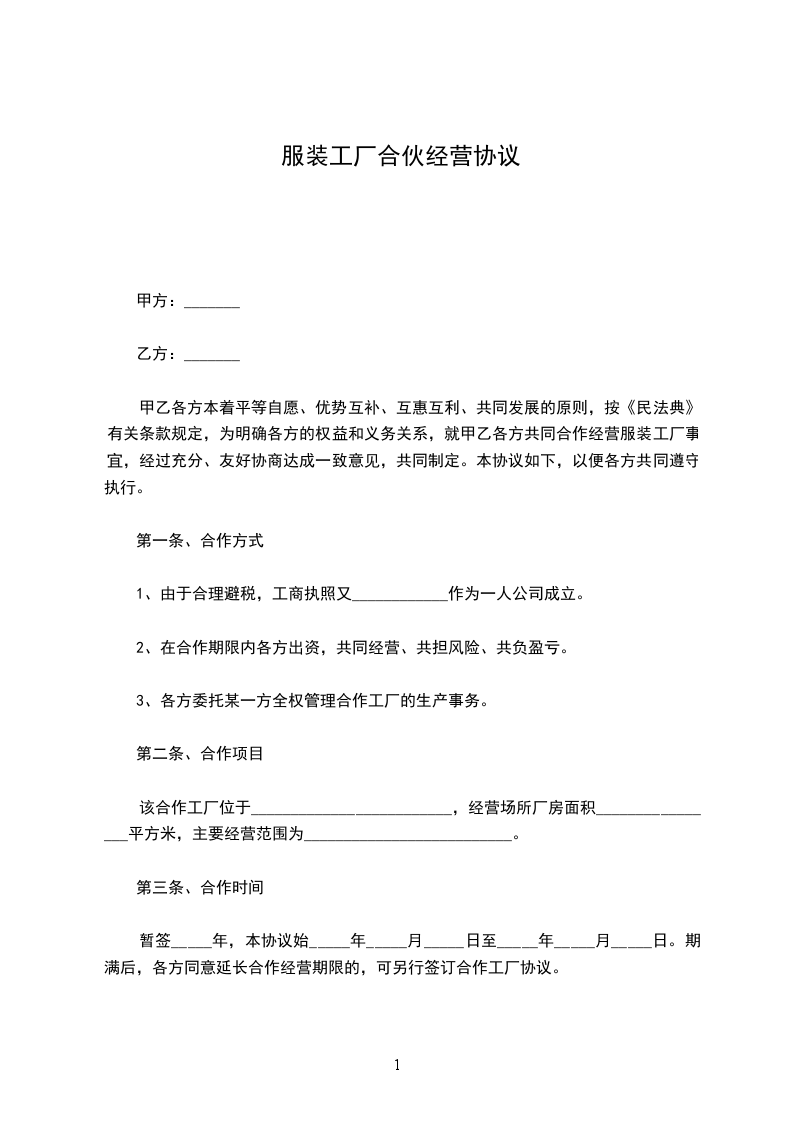 甲乙各方本着平等自愿、优势互补、互惠互利、共同发展的原则,按《民法典》有关条款规定,为明确各方的权益和义务关系,就甲乙各方共同合作经营服装工厂事宜,经过充分、友好协商达成一致意见,共同制定。本协议如下,以便各方共同遵守执行。