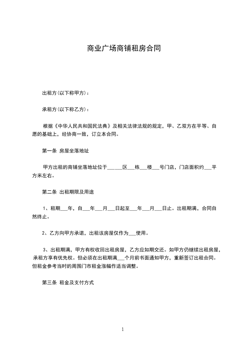1.数额:甲乙双方议定每月租金为______人民币整,租赁押金为______月租金。若需续签,续签租金甲、乙双方根据市场价另行商确定。