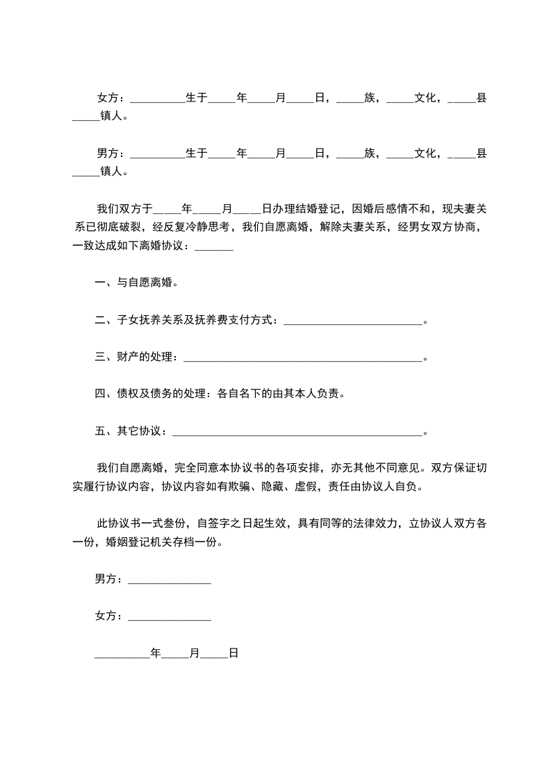 我们双方于_____年_____月_____日办理结婚登记,因婚后感情不和,现夫妻关系已彻底破裂,经反复冷静思考,我们自愿离婚,解除夫妻关系,经男女双方协商,一致达成如下离婚协议:_______