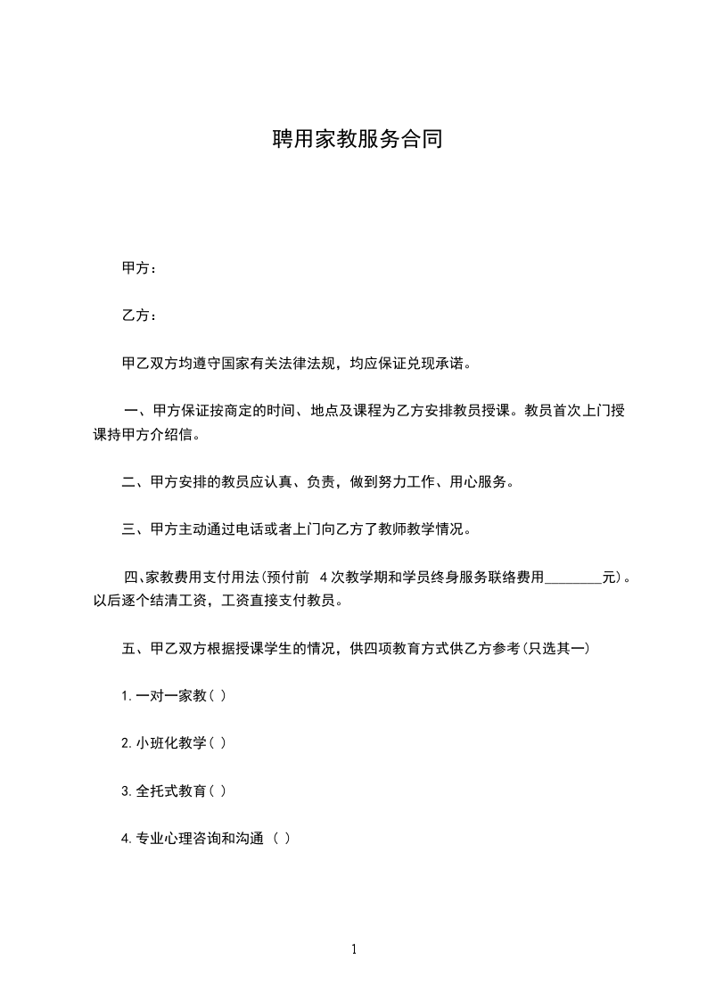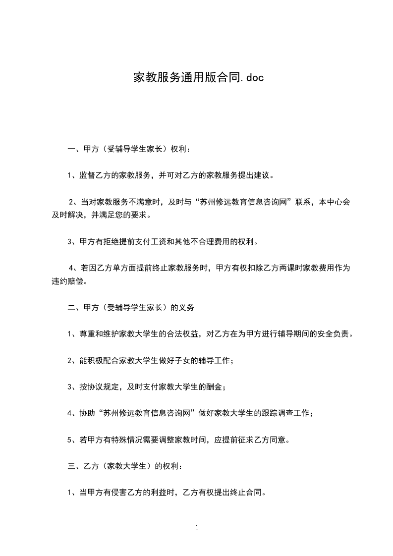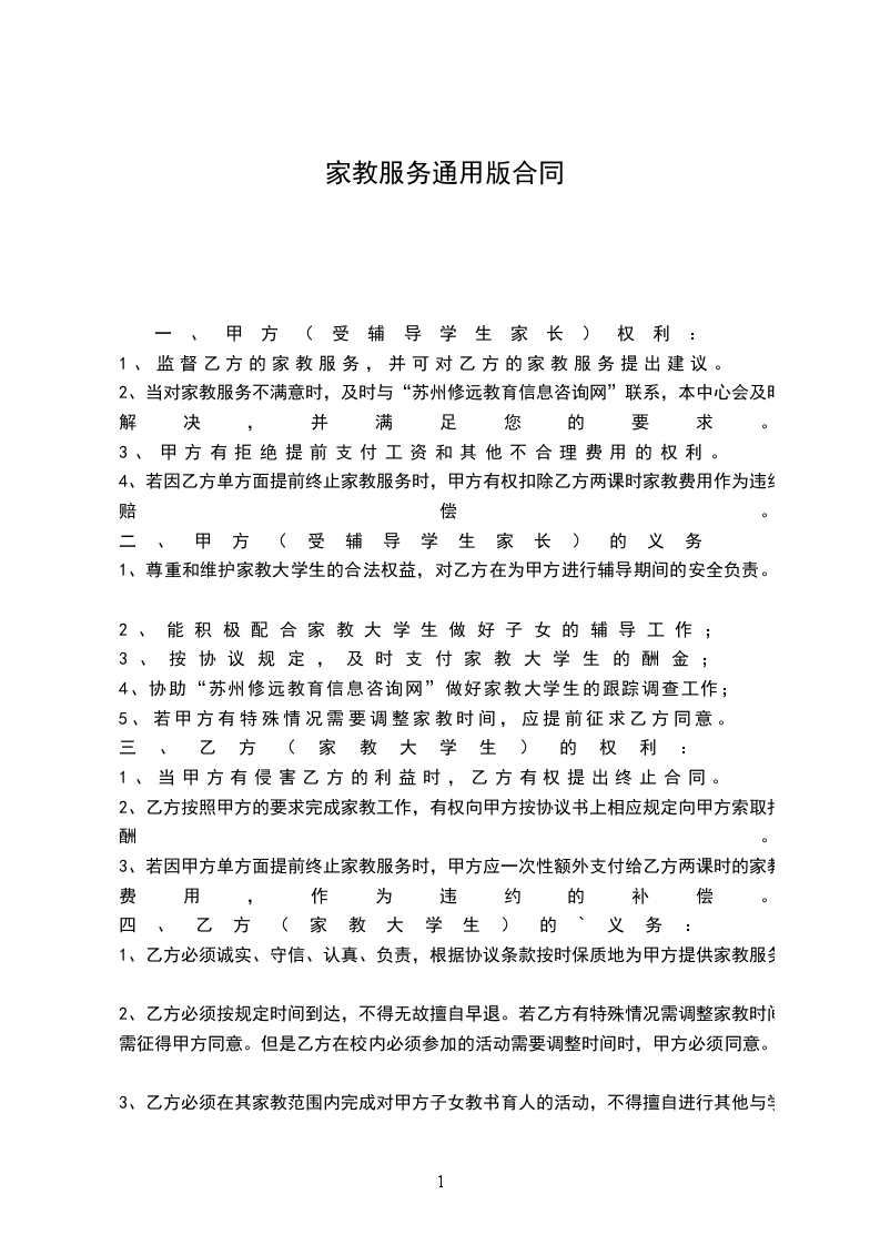 4、通过“苏州修远教育信息咨询网”网站联系的家教,须办理登记,并签订《家教协议书》。 乙方为甲方进行家教服务,签定协议如下: 家教上课地点: 家教上课时间: 每周()次每次()课时每课时()分钟 起止日期:________年____月____日—________年____月____日 家教服务内容: 乙方对甲方进行课程的辅导 甲方按课时付给乙方元课时按(月□、天□、课时□)付款。 甲方:(签字)________年____月____日 乙方:(签字)________年____月____日 其它未尽事宜,双方协商解决。 本协议一式三份,甲乙双方各执一份,另一份“苏州修远教育信息咨询网”备案。本协议自签订之日起生效,乙方完成甲方委托事项并结清价款后自动失效