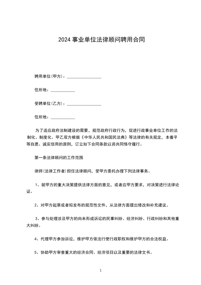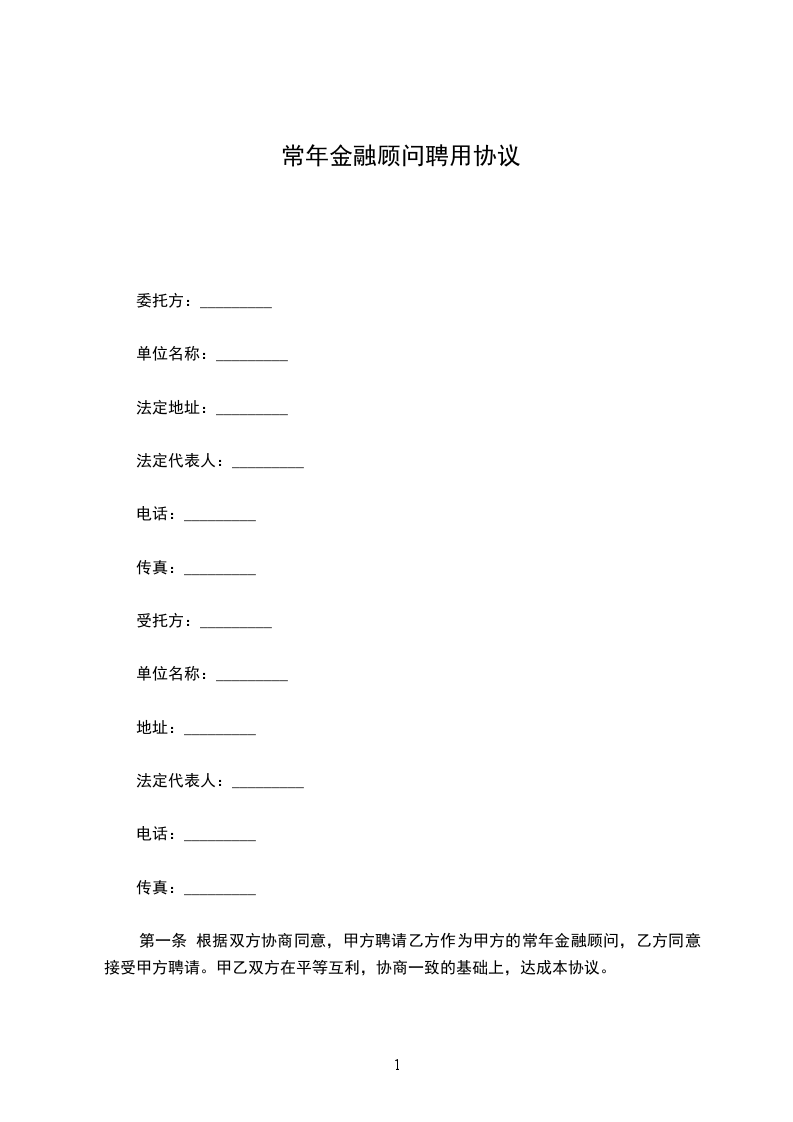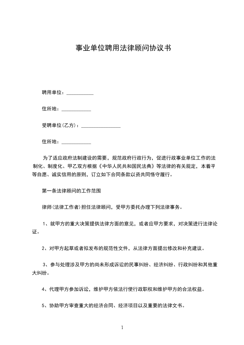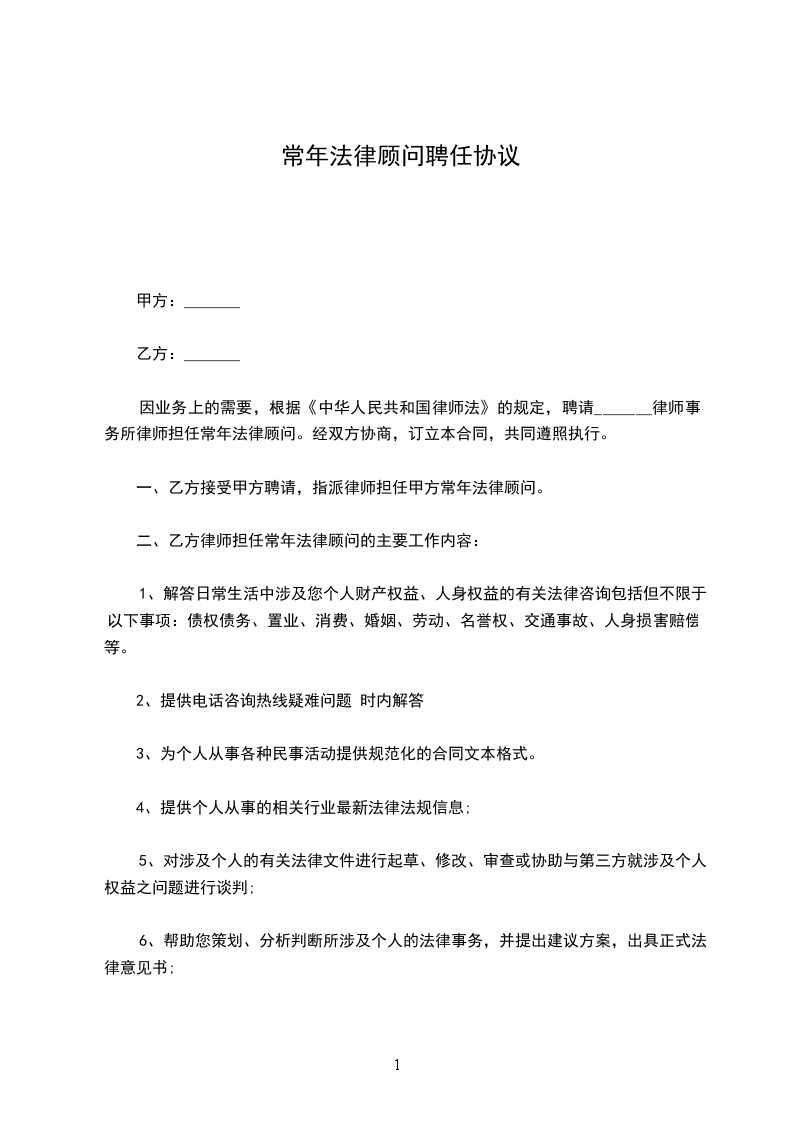 根据《中华人民共和国律师暂行条例》第二条第一款的规定,____________(简称甲方)为依法维护本单位的合法权益,特聘请____________律师事务所(简称乙方)担任常年法律顾问。乙方接受聘请。经双方协商,订立下列各条款,共同遵照履行。