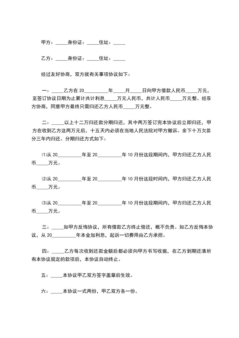一:_____乙方在20__________年_____月_____日向甲方借款人民币_____万元,至签订协议日期为止累计共计利息_____万元人民币,共计人民币_____万元整。经双方协商,同意甲方最终只需归还乙方人民币_____万元整。