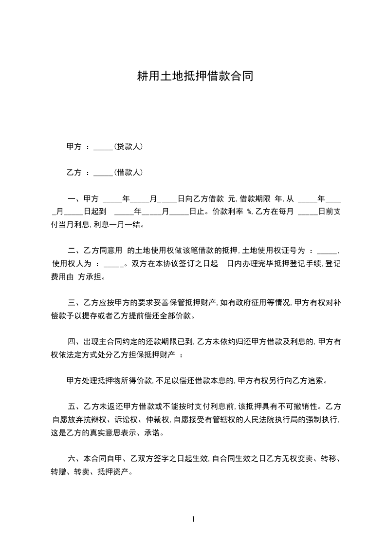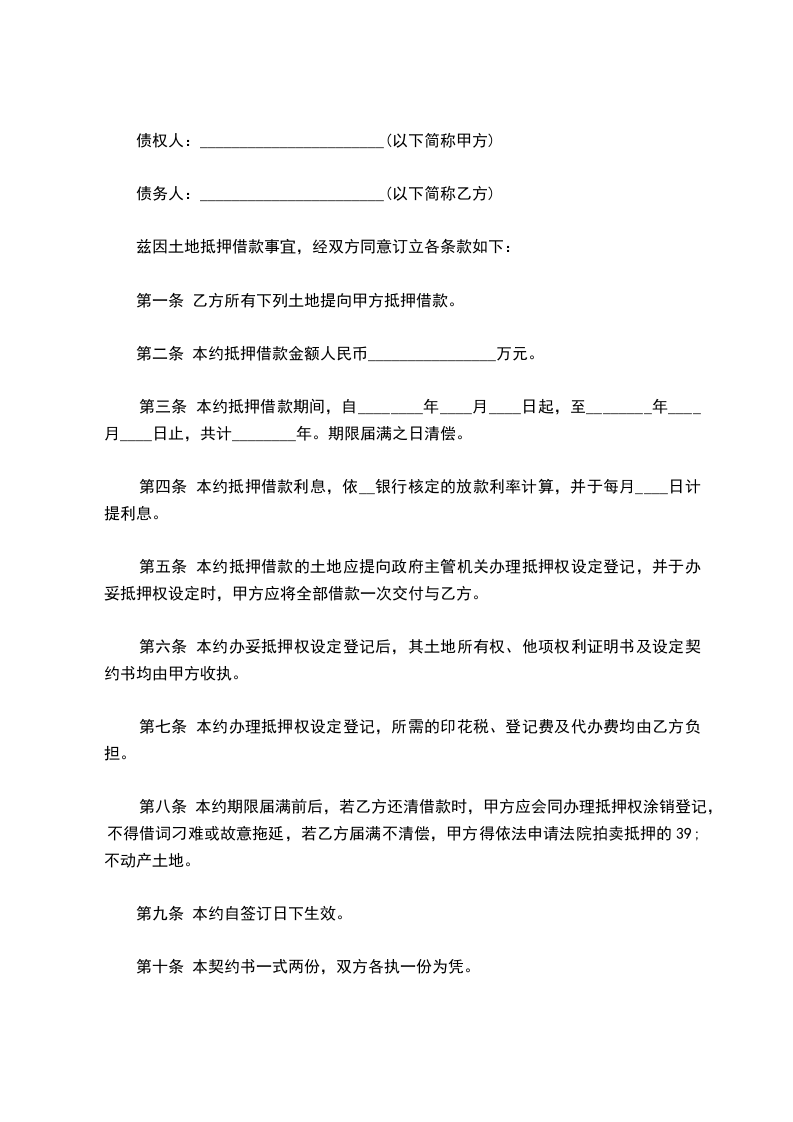 兹因土地抵押借款事宜,经双方同意订立各条款如下: