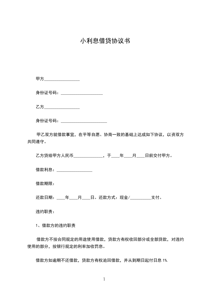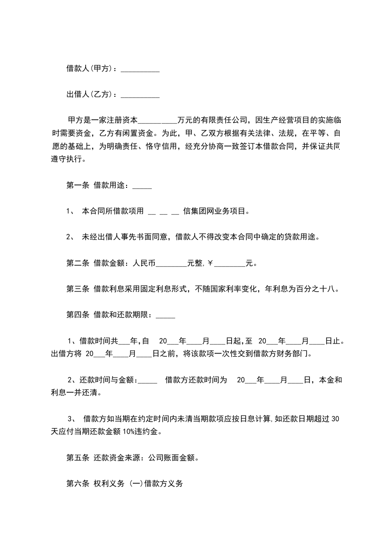 今因借款人_______从出借人_______处借得人民币_______(大写_______元整)。借款期限自_______年_____月_____日起至_______年_____月_____日止,共_______个月。约定月/年利率为百分之_______(即_______%),月/年共计利息人民币_______(大写_______元整),月息/年息于每月_______日前支付,本金及利息于_______年_____月_____日一次性还清。如不能按期足额归还借款,借款人应向出借人支付违约金人民币_______(大写_______元整)。