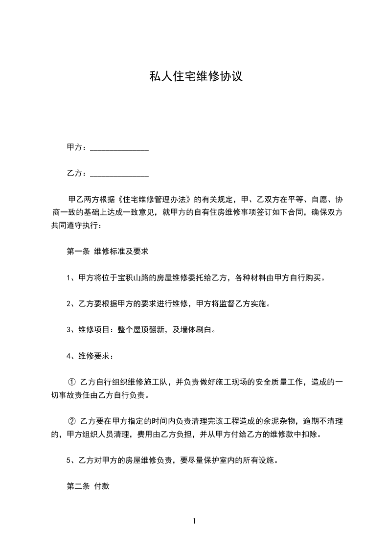 1、甲方将位于宝积山路的房屋维修委托给乙方,各种材料由甲方自行购买。