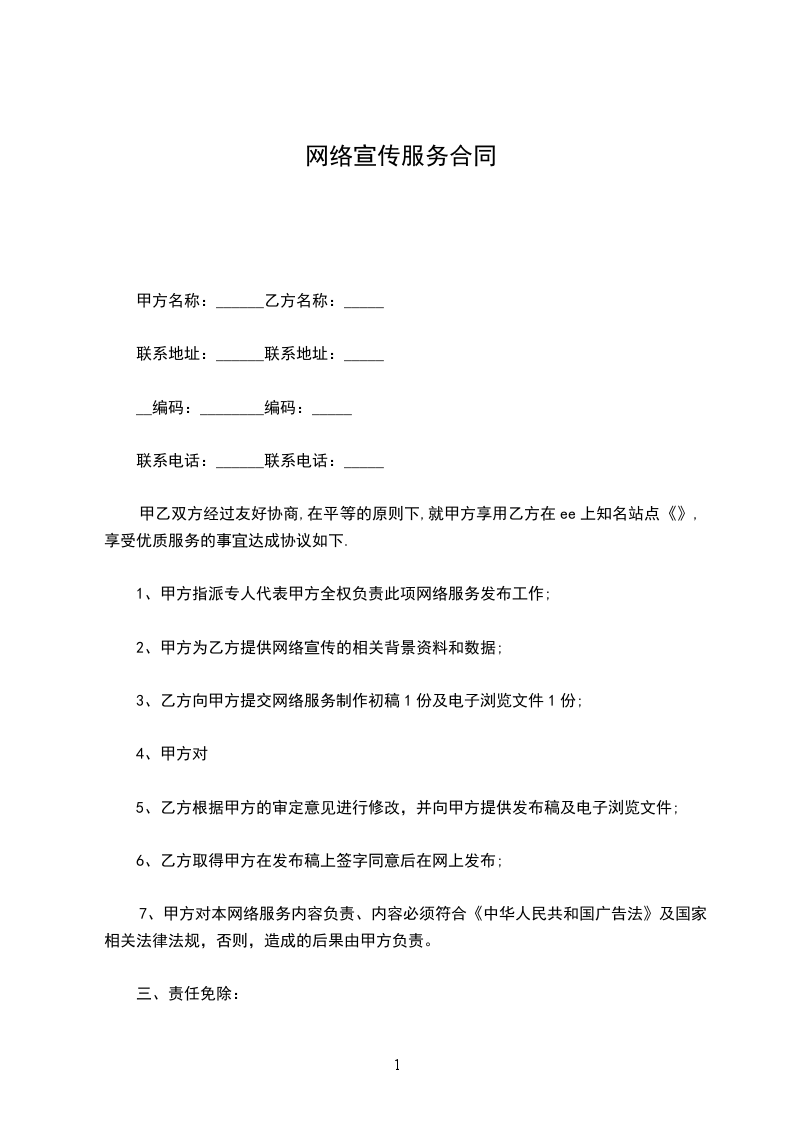 7、甲方对本网络服务内容负责、内容必须符合《中华人民共和国广告法》及国家相关法律法规,否则,造成的后果由甲方负责。