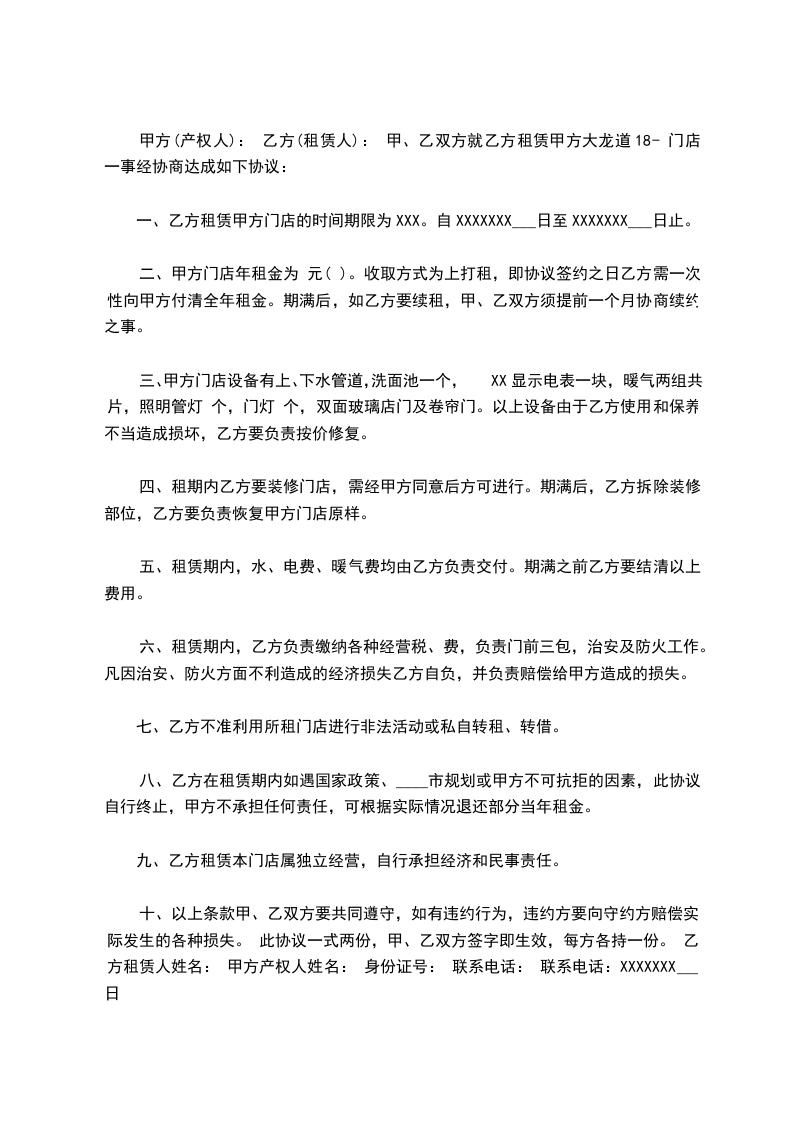 甲方(产权人): 乙方(租赁人): 甲、乙双方就乙方租赁甲方大龙道18- 门店一事经协商达成如下协议:
