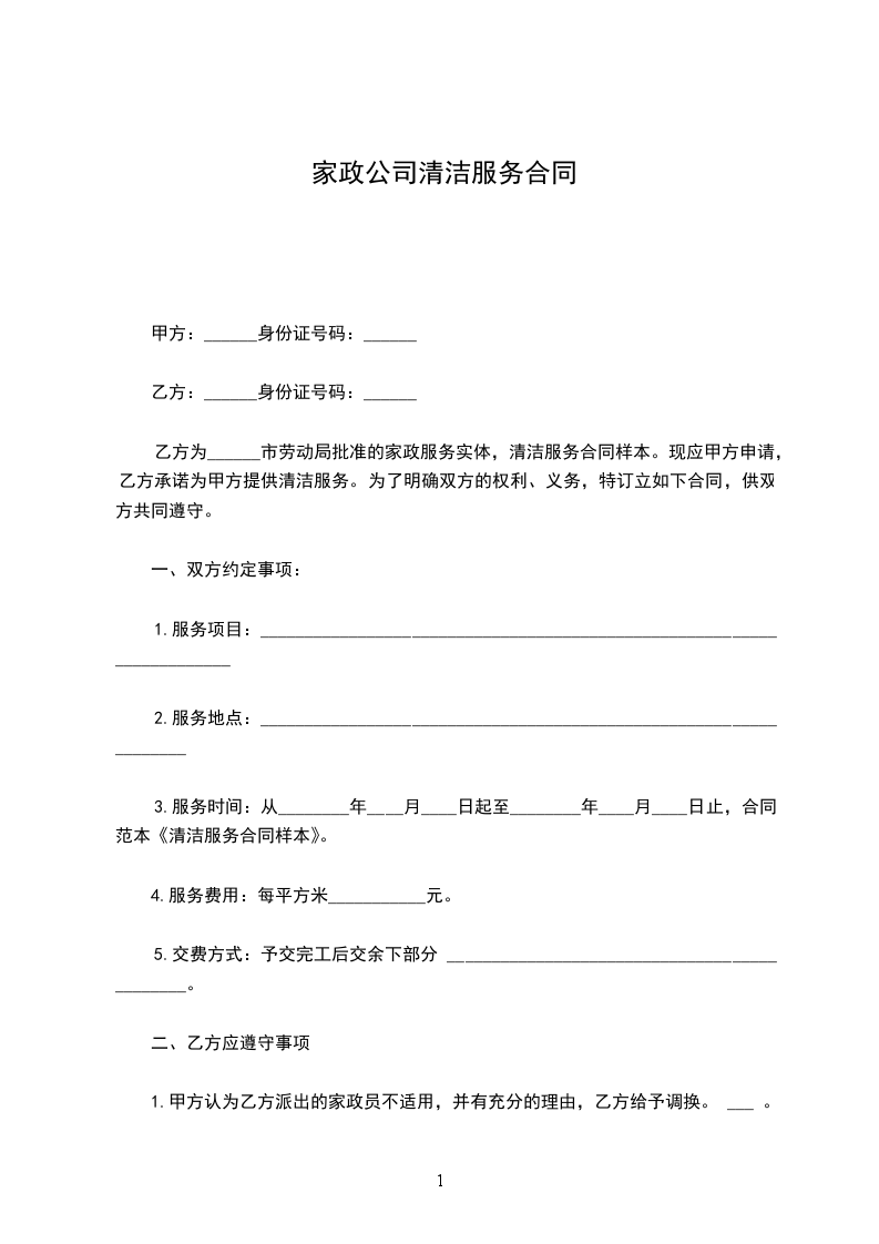乙方为______市劳动局批准的家政服务实体,清洁服务合同样本。现应甲方申请,乙方承诺为甲方提供清洁服务。为了明确双方的权利、义务,特订立如下合同,供双方共同遵守。
