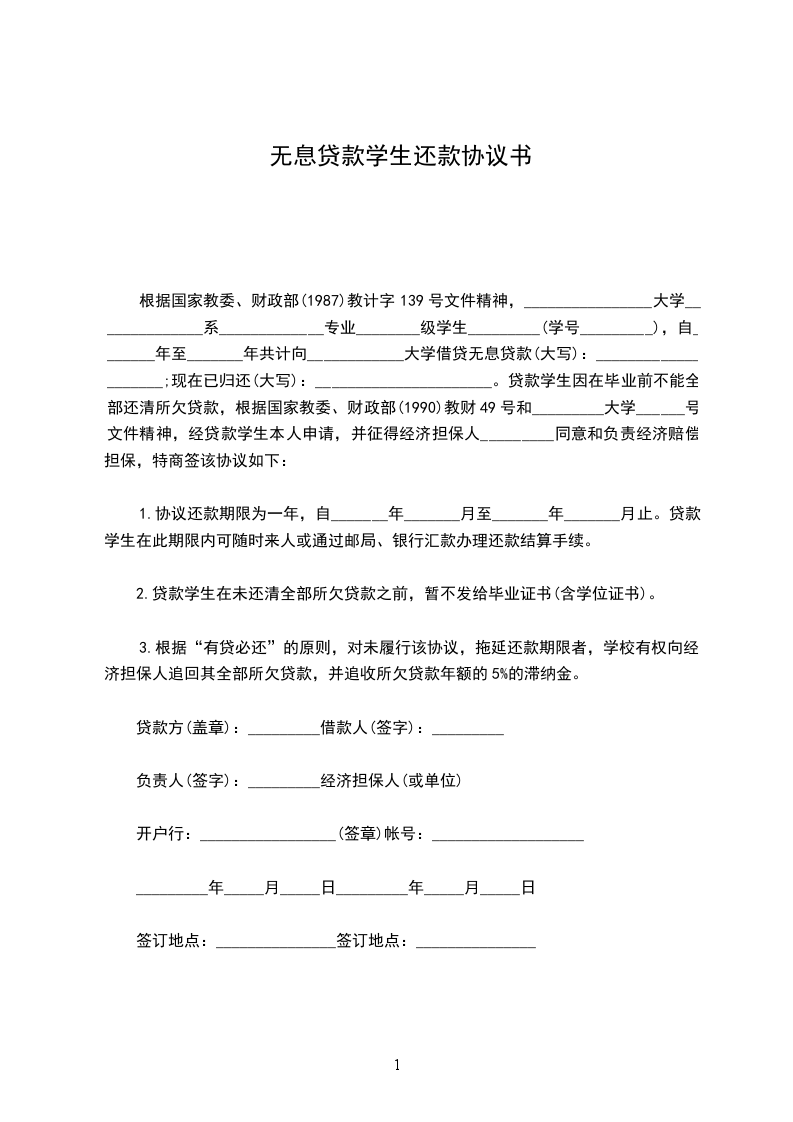 根据国家教委、财政部(1987)教计字139号文件精神,________________大学______________系_____________专业________级学生_________(学号_________),自_______年至_______年共计向____________大学借贷无息贷款(大写):____________________;现在已归还(大写):______________________。贷款学生因在毕业前不能全部还清所欠贷款,根据国家教委、财政部(1990)教财49号和_________大学______号文件精神,经贷款学生本人申请,并征得经济担保人_________同意和负责经济赔偿担保,特商签该协议如下: